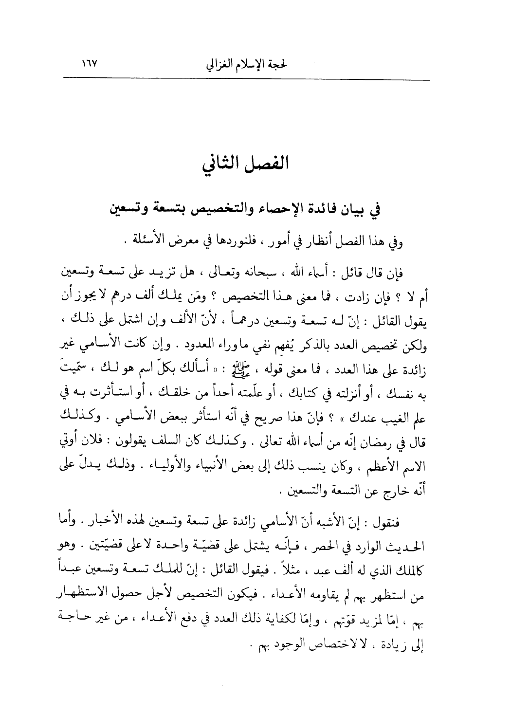 الْفَصْل الثَّانِي فِي بَيَان فَائِدَة الإحصاء والتخصيص بِتِسْعَة وَتِسْعين