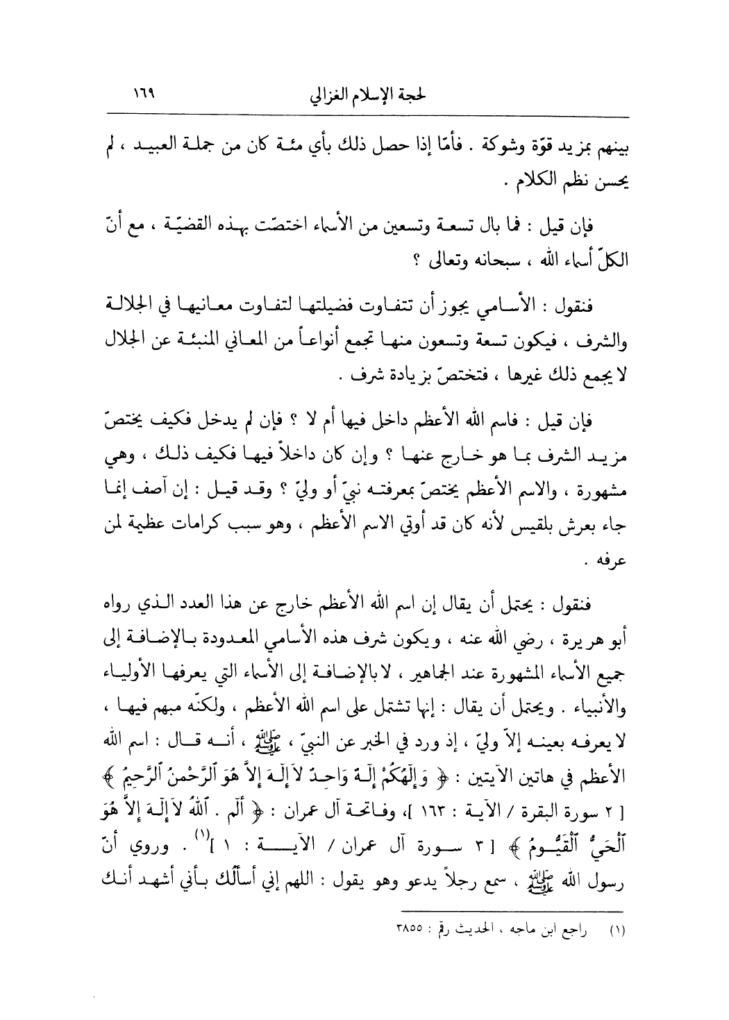 فَنَقُول يحْتَمل أَن يُقَال إِن اسْم الله الْأَعْظَم خَارج عَن هَذَا الْعدَد الَّذِي رَوَاهُ أَبُو هُرَيْرَة رَضِي الله عَنهُ وَيكون شرف هَذِه الْأَسَامِي المعدودة بِالْإِضَافَة إِلَى جَمِيع الْأَسْمَاء الْمَشْهُورَة عِنْد الجماهير لَا بِالْإِضَافَة إِلَى الْأَسْمَاء الَّتِي يعرفهَا الْأَوْلِيَاء والأنبياء وَيحْتَمل أَن يُقَال إِنَّهَا تشْتَمل على اسْم الله الْأَعْظَم وَلكنه مُبْهَم فِيهَا لَا يعرفهُ بِعَيْنِه إِلَّا ولي إِذْ ورد فِي الْخَبَر عَن النَّبِي صلى الله عَلَيْهِ وَسلم أَنه قَالَ اسْم الله الْأَعْظَم فِي هَاتين الْآيَتَيْنِ وإلهكم إِلَه وَاحِد لَا إِلَه إِلَّا هُوَ الرَّحْمَن الرَّحِيم 2 سُورَة الْبَقَرَة الْآيَة 163 وفاتحة آل عمرَان آلم الله لَا إِلَه إِلَّا هُوَ الْحَيّ القيوم 3 سُورَة آل عمرَان الْآيَة 1 وَرُوِيَ أَن رَسُول الله صلى الله عَلَيْهِ وَسلم سمع رجلا يَدْعُو وَهُوَ يَقُول اللَّهُمَّ إِنِّي أَسأَلك بِأَنِّي أشهد أَنَّك