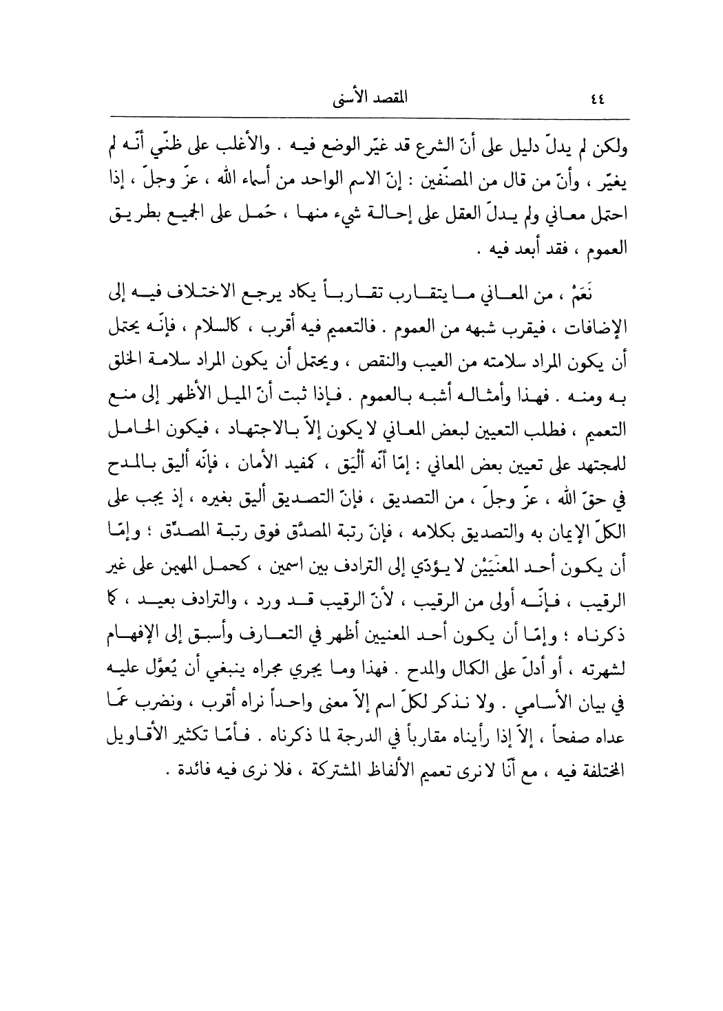 نعم من الْمعَانِي مَا يتقارب تقاربا يكَاد يرجع الِاخْتِلَاف فِيهِ إِلَى الإضافات فَيقرب شبهه من الْعُمُوم فالتعميم فِيهِ أقرب كالسلام فَإِنَّهُ يحْتَمل أَن يكون المُرَاد سَلَامَته من الْعَيْب وَالنَّقْص وَيحْتَمل أَن يكون المُرَاد سَلامَة الْخلق بِهِ وَمِنْه فَهَذَا وَأَمْثَاله أشبه بِالْعُمُومِ فَإِذا ثَبت أَن الْميل الْأَظْهر إِلَى منع التَّعْمِيم فَطلب التَّعْيِين لبَعض الْمعَانِي لَا يكون إِلَّا بِالِاجْتِهَادِ فَيكون الْحَامِل للمجتهد على تعْيين بعض الْمعَانِي إِمَّا أَنه أليق كمفيد الْأمان فَإِنَّهُ أليق بالمدح فِي حق الله عز وَجل من التَّصْدِيق فَإِن التَّصْدِيق أليق بِغَيْرِهِ إِذْ يجب على الْكل الْإِيمَان بِهِ والتصديق بِكَلَامِهِ فَإِن رُتْبَة الْمُصدق فَوق رُتْبَة الْمُصدق وَإِمَّا أَن يكون أحد الْمَعْنيين لَا يُؤَدِّي إِلَى الترادف بَين اسْمَيْنِ كحمل الْمُهَيْمِن على غير الرَّقِيب فَإِنَّهُ أولى من الرَّقِيب لِأَن الرَّقِيب قد ورد والترادف بعيد كَمَا ذَكرْنَاهُ وَإِمَّا أَن يكون أحد الْمَعْنيين أظهر فِي التعارف وأسبق إِلَى الإفهام لشهرته أَو أدل على الْكَمَال والمدح فَهَذَا وَمَا يجْرِي مجْرَاه يَنْبَغِي أَن يعول عَلَيْهِ فِي بَيَان الْأَسَامِي وَلَا نذْكر لكل اسْم إِلَّا معنى وَاحِدًا نرَاهُ أقرب ونضرب عَمَّا عداهُ صفحا إِلَّا إِذا رَأَيْنَاهُ مقاربا فِي الدرجَة لما ذَكرْنَاهُ فَأَما تَكْثِير الْأَقَاوِيل الْمُخْتَلفَة فِيهِ مَعَ أَنا لَا نرى تَعْمِيم الْأَلْفَاظ الْمُشْتَركَة فَلَا نرى فِيهِ فَائِدَة