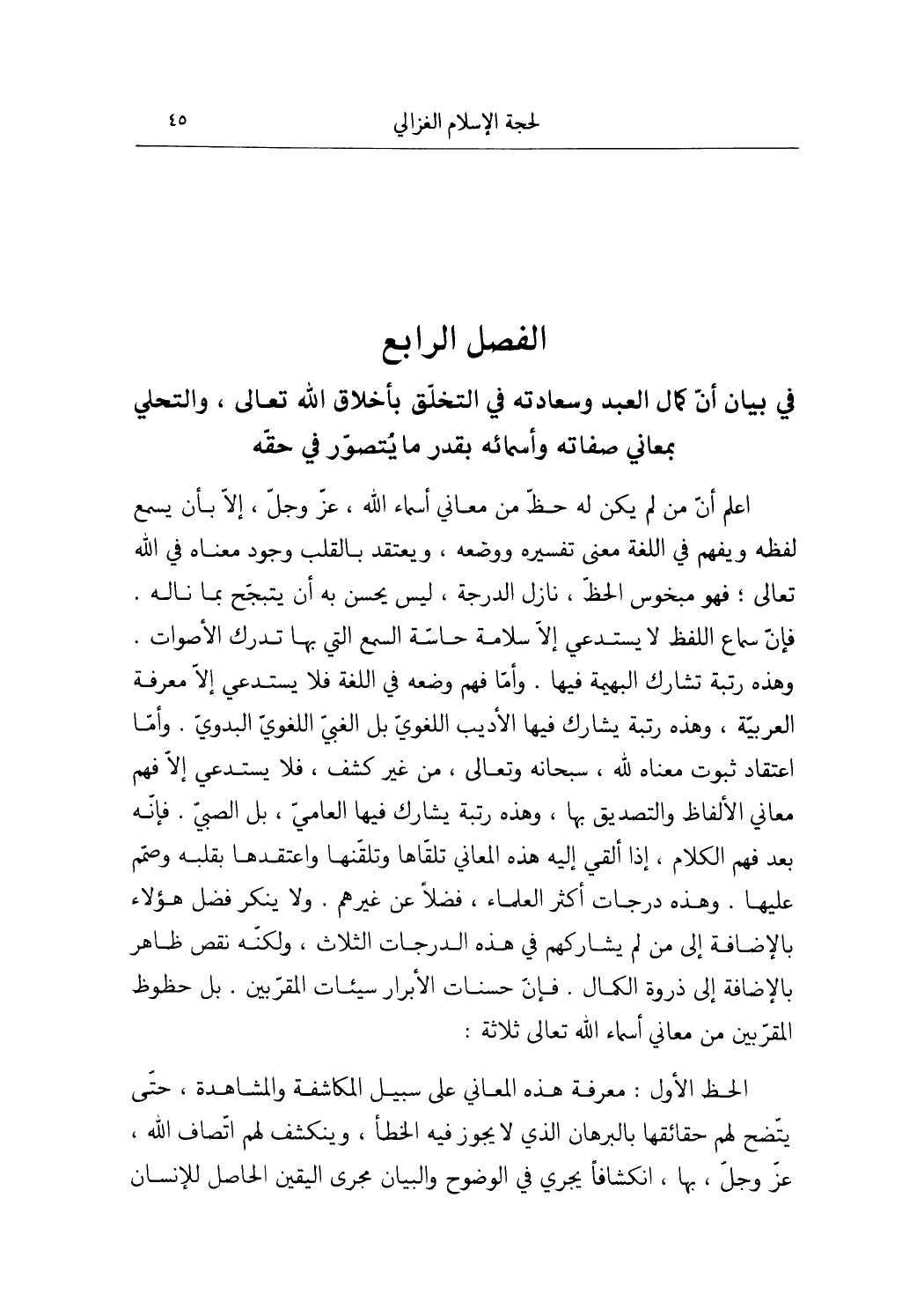 الْفَصْل الرَّابِع فِي بَيَان أَن كَمَال العَبْد وسعادته فِي التخلق بأخلاق الله تَعَالَى والتحلي بمعاني صِفَاته وأسمائه بِقدر مَا يتَصَوَّر فِي حَقه