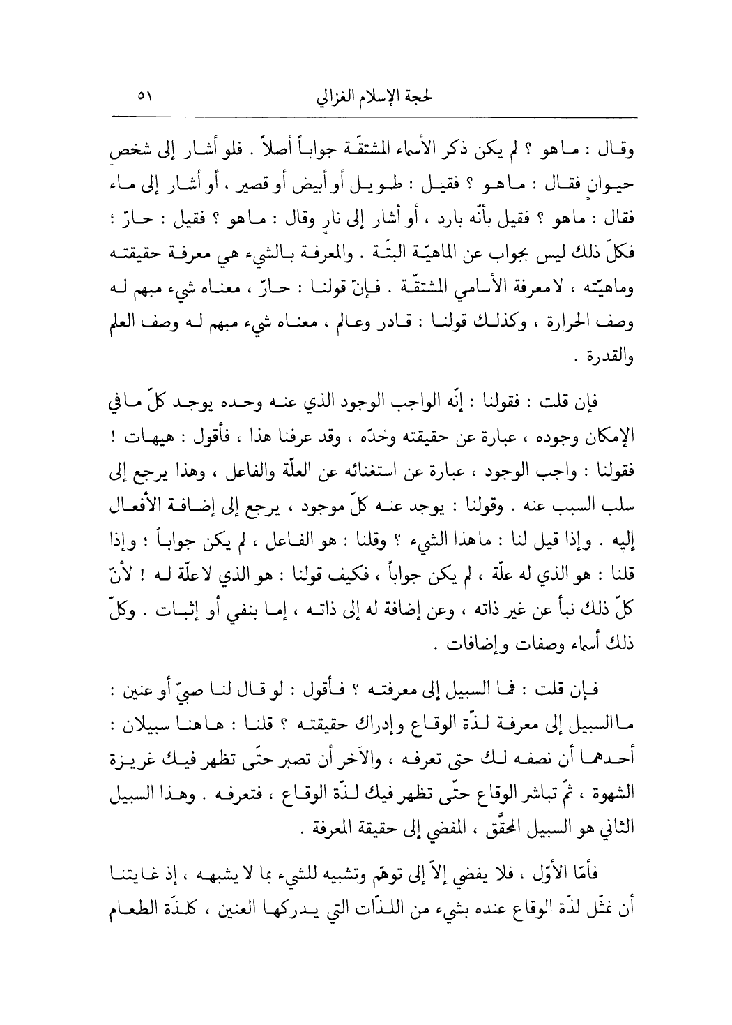 فَإِن قلت فقولنا إِنَّه الْوَاجِب الْوُجُود الَّذِي عَنهُ وَحده يُوجد كل مَا فِي الْإِمْكَان وجوده عبارَة عَن حَقِيقَته وَحده وَقد عرفنَا هَذَا فَأَقُول هَيْهَات فقولنا وَاجِب الْوُجُود عبارَة عَن استغنائه عَن الْعلَّة وَالْفَاعِل وَهَذَا يرجع إِلَى سلب السَّبَب عَنهُ وَقَوْلنَا يُوجد عَنهُ كل مَوْجُود يرجع إِلَى إِضَافَة الْأَفْعَال إِلَيْهِ وَإِذا قيل لنا مَا هَذَا الشَّيْء وَقُلْنَا هُوَ الْفَاعِل لم يكن جَوَابا وَإِذا قُلْنَا هُوَ الَّذِي لَهُ عِلّة لم يكن جَوَابا فَكيف قَوْلنَا هُوَ الَّذِي لَا عِلّة لَهُ لِأَن كل ذَلِك نبأ عَن غير ذَاته وَعَن إِضَافَة لَهُ إِلَى ذَاته إِمَّا بِنَفْي أَو إِثْبَات وكل ذَلِك أَسمَاء وصفات وإضافات