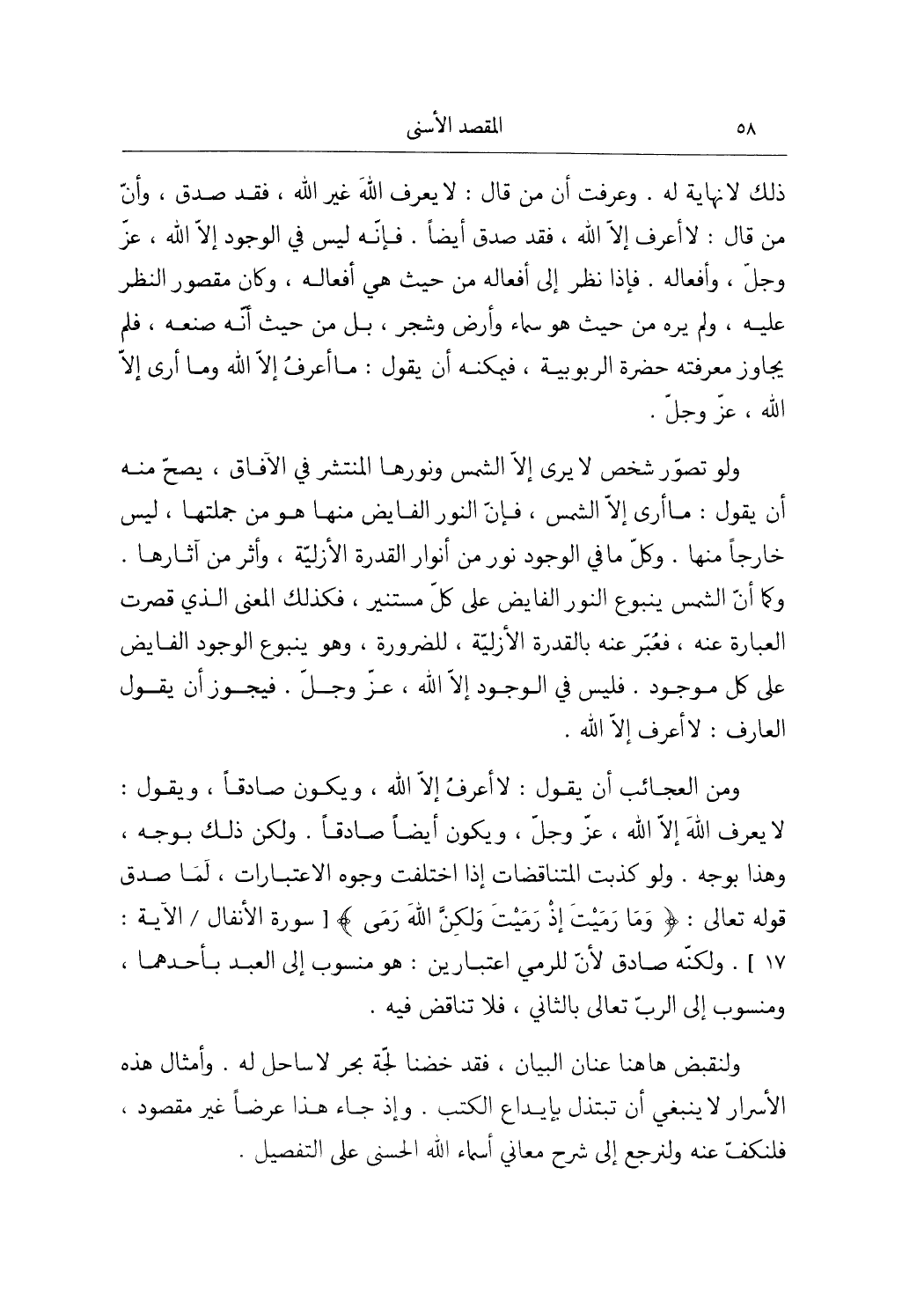 وكما أَن الشَّمْس ينبوع النُّور الفايض على كل مستنير فَكَذَلِك الْمَعْنى الَّذِي قصرت الْعبارَة عَنهُ فَعبر عَنهُ بِالْقُدْرَةِ الأزلية للضَّرُورَة وَهُوَ ينبوع الْوُجُود الفابض على كل مَوْجُود فَلَيْسَ فِي الْوُجُود إِلَّا الله عز وَجل فَيجوز أَن يَقُول الْعَارِف لَا أعرف إِلَّا الله