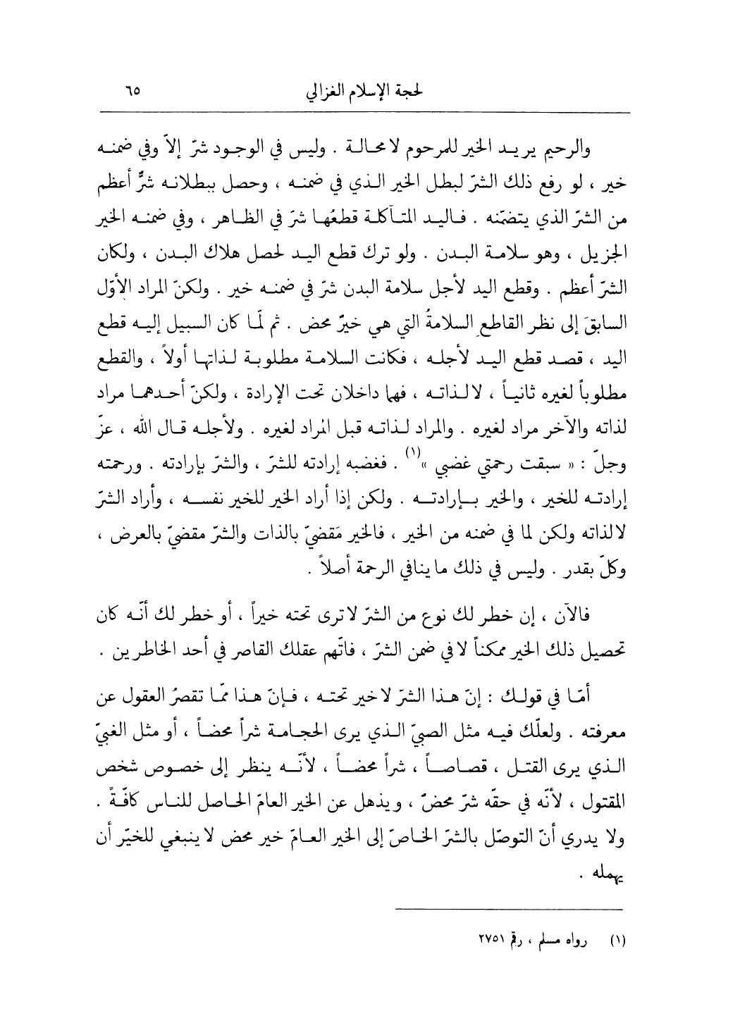 والرحيم يُرِيد الْخَيْر للمرحوم لَا محَالة وَلَيْسَ فِي الْوُجُود شَرّ إِلَّا وَفِي ضمنه خير لَو رفع ذَلِك الشَّرّ لبطل الْخَيْر الَّذِي فِي ضمنه وَحصل بِبُطْلَانِهِ شرا أعظم من الشَّرّ الَّذِي يتضمنه فاليد المتآكلة قطعهَا شَرّ فِي الظَّاهِر وَفِي ضمنه الْخَيْر الجزيل وَهُوَ سَلامَة الْبدن وَلَو ترك قطع الْيَد لحصل هَلَاك الْبدن ولكان الشَّرّ أعظم وَقطع الْيَد لأجل سَلامَة الْبدن شَرّ فِي ضمنه خير وَلَكِن المُرَاد الأول السَّابِق إِلَى نظر الْقَاطِع السَّلامَة الَّتِي هِيَ خير مَحْض ثمَّ لما كَانَ السَّبِيل إِلَيْهِ قطع الْيَد قصد قطع الْيَد لأَجله فَكَانَت السَّلامَة مَطْلُوبَة لذاتها أَولا وَالْقطع مَطْلُوبا لغيره ثَانِيًا لَا لذاته فهما داخلان تَحت الْإِرَادَة وَلَكِن أَحدهمَا مُرَاد لذاته وَالْآخر مُرَاد لغيره وَالْمرَاد لذاته قبل المُرَاد لغيره ولأجله قَالَ الله عز وَجل سبقت رَحْمَتي غَضَبي فغضبه إِرَادَته للشر وَالشَّر بإرادته وَرَحمته إِرَادَته للخير وَالْخَيْر بإرادته وَلَكِن إِذا أَرَادَ الْخَيْر للخير نَفسه وَأَرَادَ الشَّرّ لَا لذاته وَلَكِن لما فِي ضمنه من الْخَيْر فالخير مقضي بِالذَّاتِ وَالشَّر مقضي بِالْعرضِ وكل بِقدر وَلَيْسَ فِي ذَلِك مَا يُنَافِي الرَّحْمَة أصلا