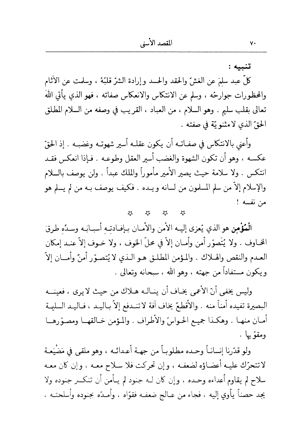 وَلَيْسَ يخفى أَن الْأَعْمَى يخَاف أَن يَنَالهُ هَلَاك من حَيْثُ لَا يرى فعينه البصيرة تفيده أمنا مِنْهُ والأقطع يخَاف آفَة لَا تنْدَفع إِلَّا بِالْيَدِ فاليد السليمة أَمَان مِنْهَا وَهَكَذَا جَمِيع الْحَواس والأطراف وَالْمُؤمن خَالِقهَا ومصورها ومقويها
