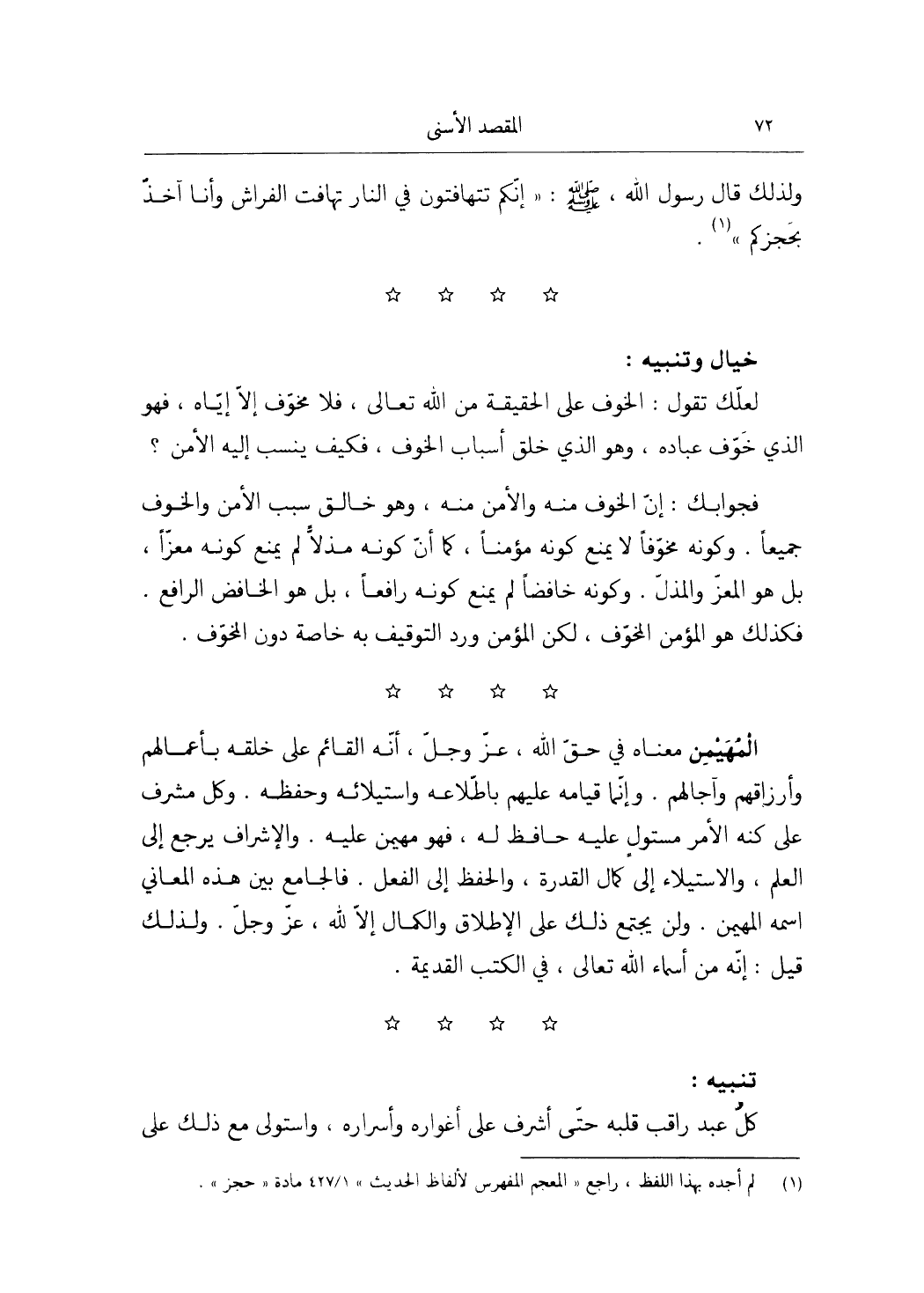وَلذَلِك قَالَ رَسُول الله صلى الله عَلَيْهِ وَسلم إِنَّكُم تتهافتون فِي النَّار تهافت الْفراش وَأَنا آخذ بِحُجزِكُمْ خيال وتنبيه