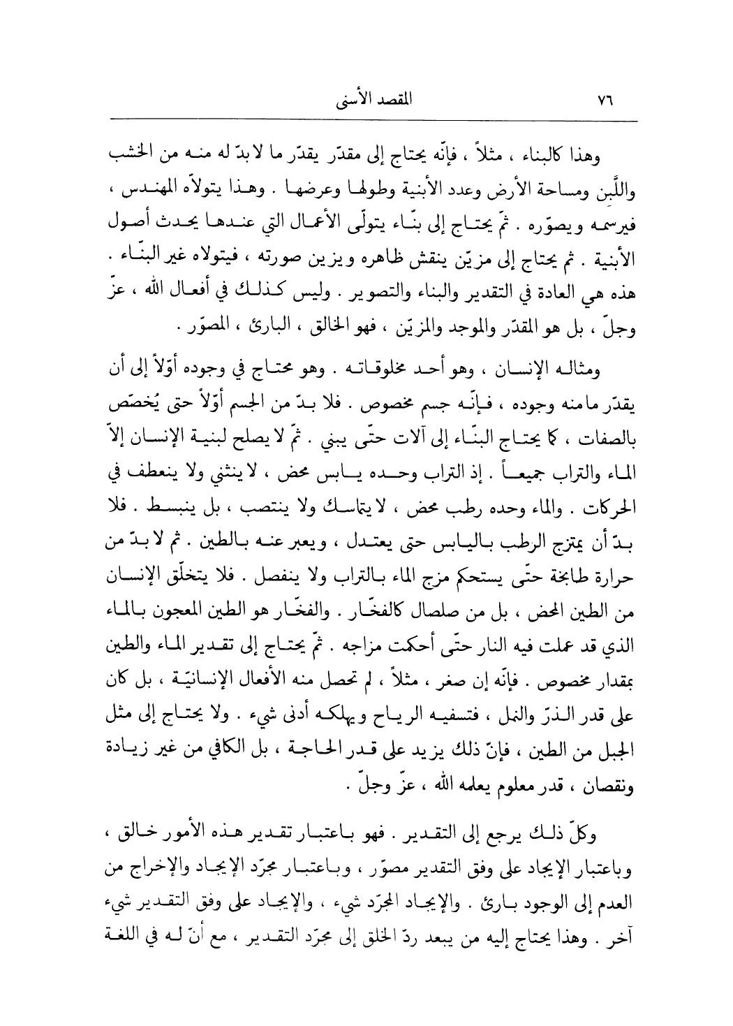 ومثاله الْإِنْسَان وَهُوَ أحد مخلوقاته وَهُوَ مُحْتَاج فِي وجوده أَولا إِلَى أَن يقدر مَا مِنْهُ وجوده فَإِنَّهُ جسم مَخْصُوص فَلَا بُد من الْجِسْم أَولا حَتَّى يخصص بِالصِّفَاتِ كَمَا يحْتَاج الْبناء إِلَى آلَات حَتَّى يَبْنِي ثمَّ لَا يصلح لبنية الْإِنْسَان إِلَّا المَاء وَالتُّرَاب جَمِيعًا إِذْ التُّرَاب وَحده يَابِس مَحْض لَا ينثني وَلَا يَنْعَطِف فِي الحركات وَالْمَاء وَحده رطب مَحْض لَا يتماسك وَلَا ينْتَصب بل ينبسط فَلَا بُد أَن يمتزج الرطب باليابس حَتَّى يعتدل ويعبر عَنهُ بالطين ثمَّ لَا بُد من حرارة طابخة حَتَّى يستحكم مزج المَاء بِالتُّرَابِ وَلَا ينْفَصل فَلَا يتخلق الْإِنْسَان من الطين الْمَحْض بل من صلصال كالفخار والفخار هُوَ الطين المعجون بِالْمَاءِ الَّذِي قد عملت فِيهِ النَّار حَتَّى أحكمت مزاجه ثمَّ يحْتَاج إِلَى تَقْدِير المَاء والطين بِمِقْدَار مَخْصُوص فَإِنَّهُ إِن صغر مثلا لم تحصل مِنْهُ الْأَفْعَال الإنسانية بل كَانَ على قدر الذَّر والنمل فتسفيه الرِّيَاح ويهلكه أدنى شَيْء وَلَا يحْتَاج إِلَى مثل الْجَبَل من الطين فَإِن ذَلِك يزِيد على قدر الْحَاجة بل الْكَافِي من غير زِيَادَة ونقصان قدر مَعْلُوم يُعلمهُ الله عز وَجل