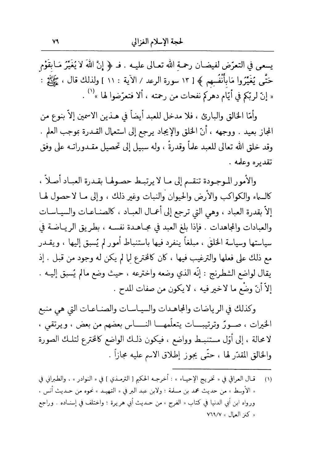 والأمور الْمَوْجُودَة تَنْقَسِم إِلَى مَا لَا يرتبط حُصُولهَا بقدرة الْعباد أصلا كالسماء وَالْكَوَاكِب وَالْأَرْض وَالْحَيَوَان والنبات وَغير ذَلِك وَإِلَى مَا لَا حُصُول لَهَا إِلَّا بقدرة الْعباد وَهِي الَّتِي ترجع إِلَى أَعمال الْعباد كالصناعات والسياسات والعبادات والمجاهدات فَإِذا بلغ العَبْد فِي مجاهدة نَفسه بطرِيق الرياضة فِي سياستها وسياسة الْخلق مبلغا ينْفَرد فِيهَا باستنباط أُمُور لم يسْبق إِلَيْهَا وَيقدر مَعَ ذَلِك على فعلهَا وَالتَّرْغِيب فِيهَا كَانَ كالمخترع لما لم يكن لَهُ وجود من قبل إِذْ يُقَال لواضع الشطرنج إِنَّه الَّذِي وَضعه واخترعه حَيْثُ وضع مَا لم يسْبق إِلَيْهِ إِلَّا أَن وضع مَا لَا خير فِيهِ لَا يكون من صِفَات الْمَدْح