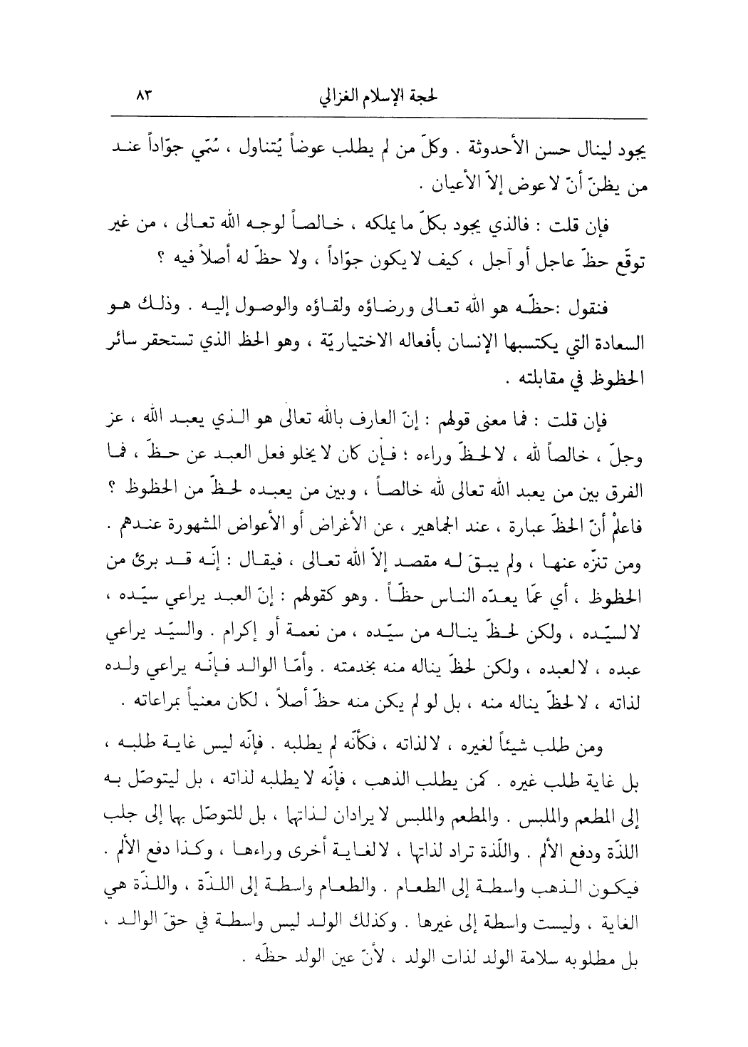 فَإِن قلت فَمَا معنى قَوْلهم إِن الْعَارِف بِاللَّه تَعَالَى هُوَ الَّذِي يعبد الله عز وَجل خَالِصا لله لَا لحظ وَرَاءه فَإِن كَانَ لَا يَخْلُو فعل العَبْد عَن حَظّ فَمَا الْفرق بَين من يعبد الله تَعَالَى لله خَالِصا وَبَين من يعبده لحظ من الحظوظ فَاعْلَم أَن الْحَظ عبارَة عِنْد الجماهير عَن الْأَغْرَاض أَو الأعواض الْمَشْهُورَة عِنْدهم وَمن تنزه عَنْهَا وَلم يبْق لَهُ مقصد إِلَّا الله تَعَالَى فَيُقَال إِنَّه قد برِئ من الحظوظ أَي عَمَّا يعده النَّاس حظا وَهُوَ كَقَوْلِهِم إِن العَبْد يُرَاعِي سَيّده لَا لسَيِّده وَلَكِن لحظ يَنَالهُ من سَيّده من نعْمَة أَو إكرام وَالسَّيِّد يُرَاعِي عَبده لَا لعَبْدِهِ وَلَكِن لحظ يَنَالهُ مِنْهُ بخدمته وَأما الْوَالِد فَإِنَّهُ يُرَاعِي وَلَده لذاته لَا لحظ يَنَالهُ مِنْهُ بل لَو لم يكن مِنْهُ حَظّ أصلا لَكَانَ معنيا بمراعاته