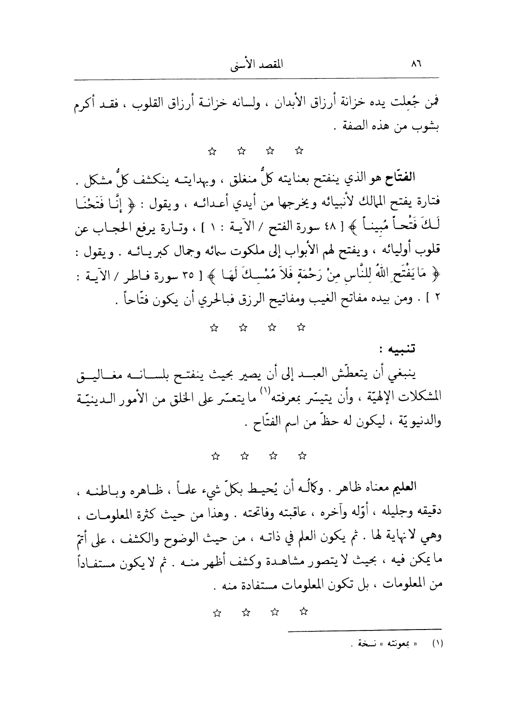 يَنْبَغِي أَن يتعطش العَبْد إِلَى أَن يصير بِحَيْثُ ينفتح بِلِسَانِهِ مغاليق المشكلات الإلهية وَأَن يَتَيَسَّر بمعرفته مَا يتعسر على الْخلق من الْأُمُور الدِّينِيَّة والدنيوية ليَكُون لَهُ حَظّ من اسْم الفتاح