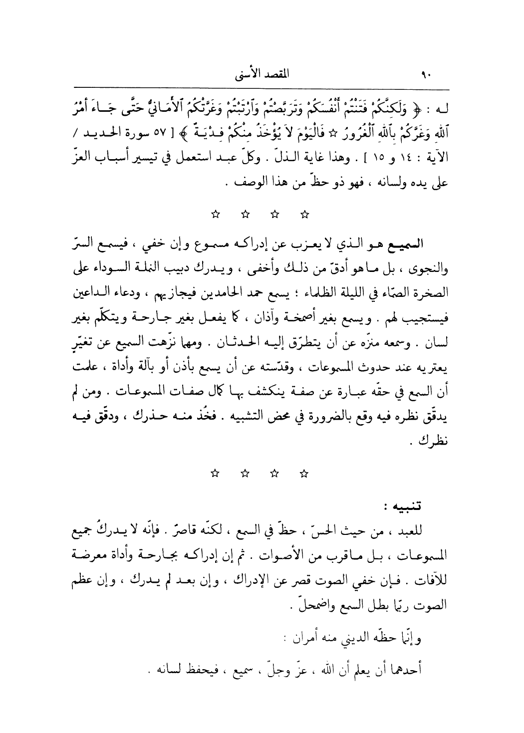 هُوَ الَّذِي لَا يعزب عَن إِدْرَاكه مسموع وَإِن خَفِي فَيسمع السِّرّ والنجوى بل مَا هُوَ أدق من ذَلِك وأخفى وَيدْرك دَبِيب النملة السَّوْدَاء على الصَّخْرَة الصماء فِي اللَّيْلَة الظلماء يسمع حمد الحامدين فيجازيهم وَدُعَاء الداعين فيستجيب لَهُم وَيسمع بِغَيْر أَصْمِخَة وآذان كَمَا يفعل بِغَيْر جارحة وَيتَكَلَّم بِغَيْر لِسَان وسَمعه منزه عَن أَن يتَطَرَّق إِلَيْهِ الْحدثَان وَمهما نزهت السَّمِيع عَن تغير يَعْتَرِيه عِنْد حُدُوث المسموعات وقدسته عَن أَن يسمع بأذن أَو بِآلَة وأداة علمت أَن السّمع فِي حَقه عبارَة عَن صفة ينْكَشف بهَا كَمَال صِفَات المسموعات وَمن لم يدقق نظره فِيهِ وَقع بِالضَّرُورَةِ فِي مَحْض التَّشْبِيه فَخذ مِنْهُ حذرك ودقق فِيهِ نظرك تَنْبِيه