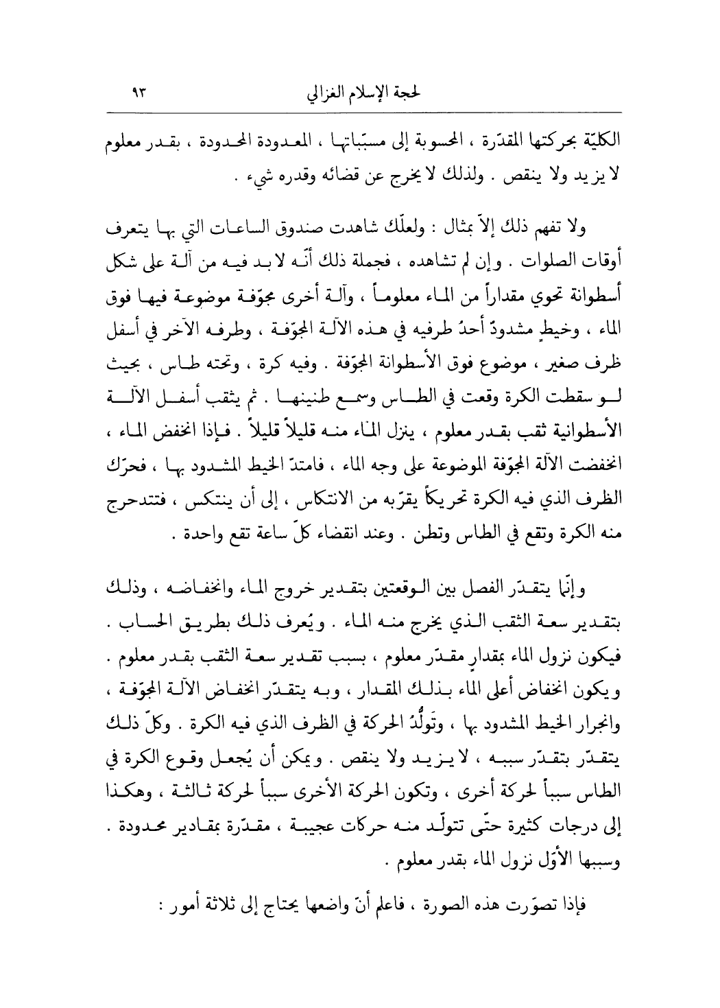 وَيكون انخفاض أَعلَى المَاء بذلك الْمِقْدَار وَبِه يتَقَدَّر انخفاض الْآلَة المجوفة وانجرار الْخَيط المشدود بهَا وتولد الْحَرَكَة فِي الظّرْف الَّذِي فِيهِ الكرة وكل ذَلِك يتَقَدَّر بتقدر سَببه لَا يزِيد وَلَا ينقص وَيُمكن أَن يَجْعَل وُقُوع الكرة فِي الطاس سَببا لحركة أُخْرَى وَتَكون الْحَرَكَة الْأُخْرَى سَببا لحركة ثَالِثَة وَهَكَذَا إِلَى دَرَجَات كَثِيرَة حَتَّى تتولد مِنْهُ حركات عَجِيبَة مقدرَة بمقادير محدودة