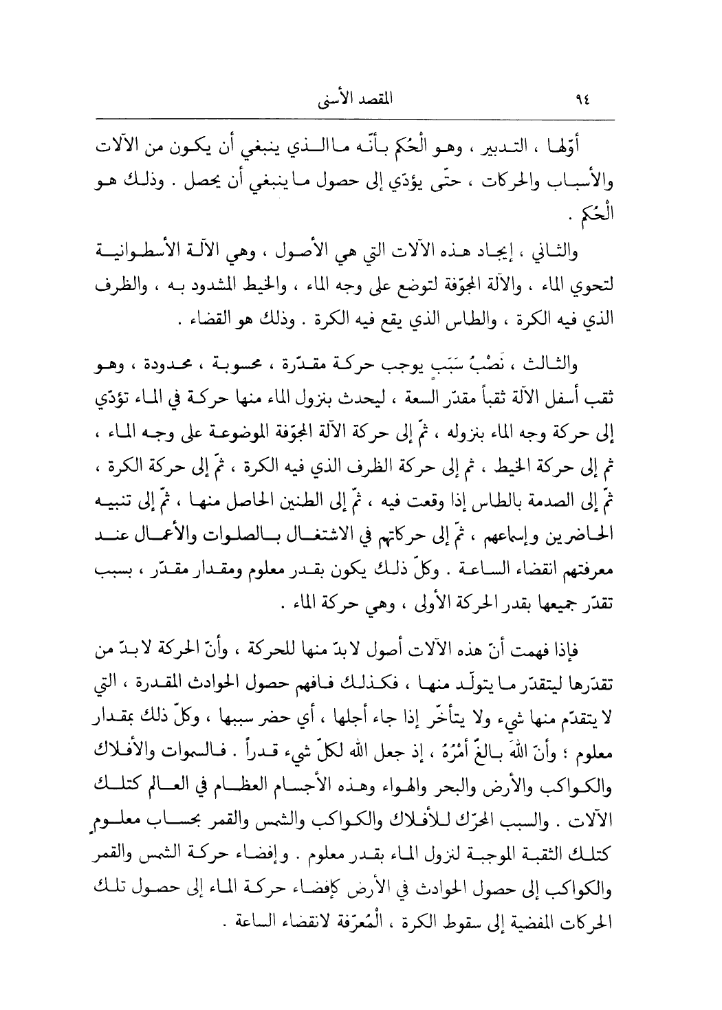 فَإِذا فهمت أَن هَذِه الْآلَات أصُول لَا بُد مِنْهَا للحركة وَأَن الْحَرَكَة لَا بُد من تقدرها ليتقدر مَا يتَوَلَّد مِنْهَا فَكَذَلِك فَافْهَم حُصُول الْحَوَادِث الْمقدرَة الَّتِي لَا يتَقَدَّم مِنْهَا شَيْء وَلَا يتَأَخَّر إِذا جَاءَ أجلهَا أَي حضر سَببهَا وكل ذَلِك بِمِقْدَار مَعْلُوم وَأَن الله بَالغ أمره إِذْ جعل الله لكل شَيْء قدرا فالسموات والأفلاك وَالْكَوَاكِب وَالْأَرْض وَالْبَحْر والهواء وَهَذِه الْأَجْسَام الْعِظَام فِي الْعَالم كتلك الْآلَات وَالسَّبَب المحرك للأفلاك وَالْكَوَاكِب وَالشَّمْس وَالْقَمَر بِحِسَاب مَعْلُوم كتلك الثقبة الْمُوجبَة لنزول المَاء بِقدر مَعْلُوم وإفضاء حَرَكَة الشَّمْس وَالْقَمَر وَالْكَوَاكِب إِلَى حُصُول الْحَوَادِث فِي الأَرْض كإفضاء حَرَكَة المَاء إِلَى حُصُول تِلْكَ الحركات المفضية إِلَى سُقُوط الكرة الْمعرفَة لانقضاء السَّاعَة