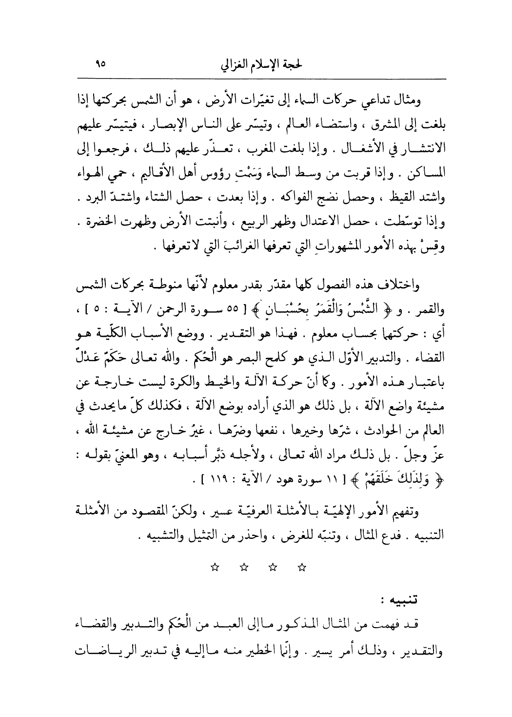 وَاخْتِلَاف هَذِه الْفُصُول كلهَا مُقَدّر بِقدر مَعْلُوم لِأَنَّهَا منوطة بحركات الشَّمْس وَالْقَمَر وَالشَّمْس وَالْقَمَر بحسبان 55 سُورَة الرَّحْمَن / الْآيَة 5 أَي حركتهما بِحِسَاب مَعْلُوم فَهَذَا هُوَ التَّقْدِير وَوضع الْأَسْبَاب الْكُلية هُوَ الْقَضَاء وَالتَّدْبِير الأول الَّذِي هُوَ كلمح الْبَصَر هُوَ الحكم وَالله تَعَالَى حكم عدل بِاعْتِبَار هَذِه الْأُمُور وكما أَن حَرَكَة الْآلَة وَالْخَيْط والكرة لَيست خَارِجَة عَن مَشِيئَة وَاضع الْآلَة بل ذَلِك هُوَ الَّذِي أَرَادَهُ بِوَضْع الْآلَة فَكَذَلِك كل مَا يحدث فِي الْعَالم من الْحَوَادِث شَرها وَخَيرهَا نَفعهَا وضرها غير خَارج عَن مَشِيئَة الله عز وَجل بل ذَلِك مُرَاد الله تَعَالَى ولأجله دبر أَسبَابه وَهُوَ المعني بقوله وَلذَلِك خلقهمْ 11 سُورَة هود / الْآيَة 119