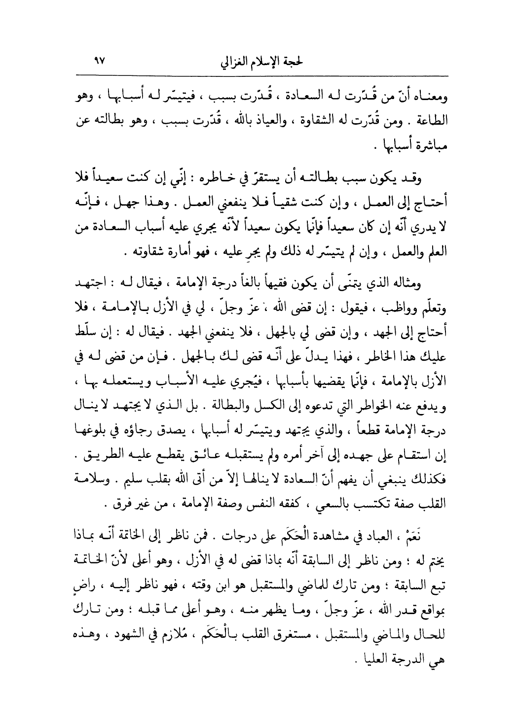 ومثاله الَّذِي يتَمَنَّى أَن يكون فَقِيها بَالغا دَرَجَة الْإِمَامَة فَيُقَال لَهُ اجْتهد وَتعلم وواظب فَيَقُول إِن قضى الله عز وَجل لي فِي الْأَزَل بِالْإِمَامَةِ فَلَا أحتاج إِلَى الْجهد وَإِن قضى لي بِالْجَهْلِ فَلَا يَنْفَعنِي الْجهد فَيُقَال لَهُ إِن سلط عَلَيْك هَذَا الخاطر فَهَذَا يدل على أَنه قضى لَك بِالْجَهْلِ فَإِن من قضى لَهُ فِي الْأَزَل بِالْإِمَامَةِ فَإِنَّمَا يَقْضِيهَا بأسبابها فَيجْرِي عَلَيْهِ الْأَسْبَاب ويستعمله بهَا وَيدْفَع عَنهُ الخواطر الَّتِي تَدعُوهُ إِلَى الكسل والبطالة بل الَّذِي لَا يجْتَهد لَا ينَال دَرَجَة الْإِمَامَة قطعا وَالَّذِي يجْتَهد ويتيسر لَهُ أَسبَابهَا يصدق رجاؤه فِي بُلُوغهَا إِن استقام على جهده إِلَى آخر أمره وَلم يستقبله عائق يقطع عَلَيْهِ الطَّرِيق فَكَذَلِك يَنْبَغِي أَن يفهم أَن السَّعَادَة لَا ينالها إِلَّا من أَتَى الله بقلب سليم وسلامة الْقلب صفة تكتسب بالسعي كفقه النَّفس وَصفَة الْإِمَامَة من غير فرق