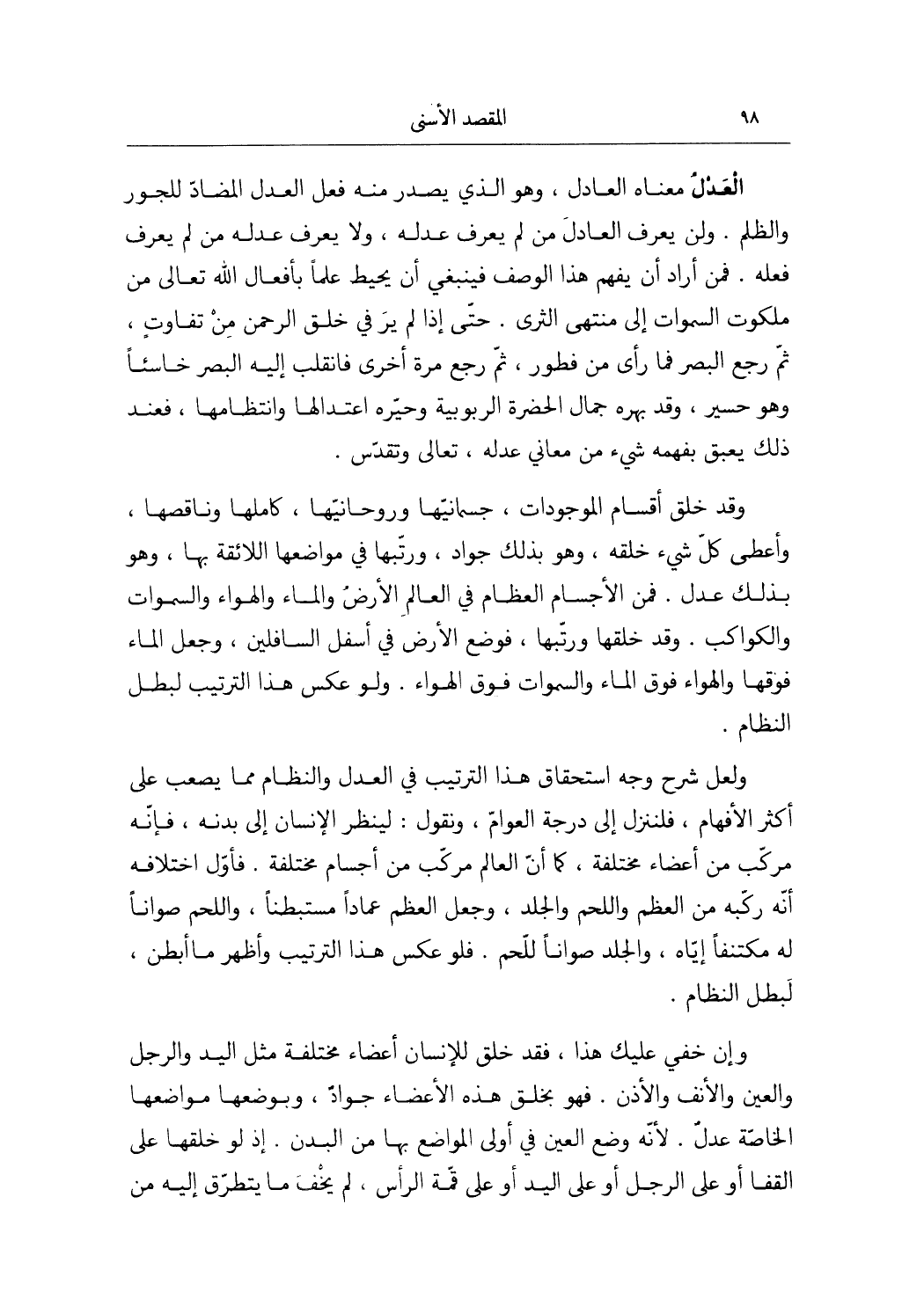 مَعْنَاهُ الْعَادِل وَهُوَ الَّذِي يصدر مِنْهُ فعل الْعدْل المضاد للجور وَالظُّلم وَلنْ يعرف الْعَادِل من لم يعرف عدله وَلَا يعرف عدله من لم يعرف فعله فَمن أَرَادَ أَن يفهم هَذَا الْوَصْف فَيَنْبَغِي أَن يُحِيط علما بِأَفْعَال الله تَعَالَى من ملكوت السَّمَوَات إِلَى مُنْتَهى الثرى حَتَّى إِذا لم ير فِي خلق الرَّحْمَن من تفَاوت ثمَّ رَجَعَ الْبَصَر فَمَا رأى من فطور ثمَّ رَجَعَ مرّة أُخْرَى فَانْقَلَبَ إِلَيْهِ الْبَصَر خاسئا وَهُوَ حسير وَقد بهره جمال الحضرة الربوبية وحيره اعتدالها وانتظامها فَعِنْدَ ذَلِك يعبق بفهمه شَيْء من مَعَاني عدله تَعَالَى وتقدس