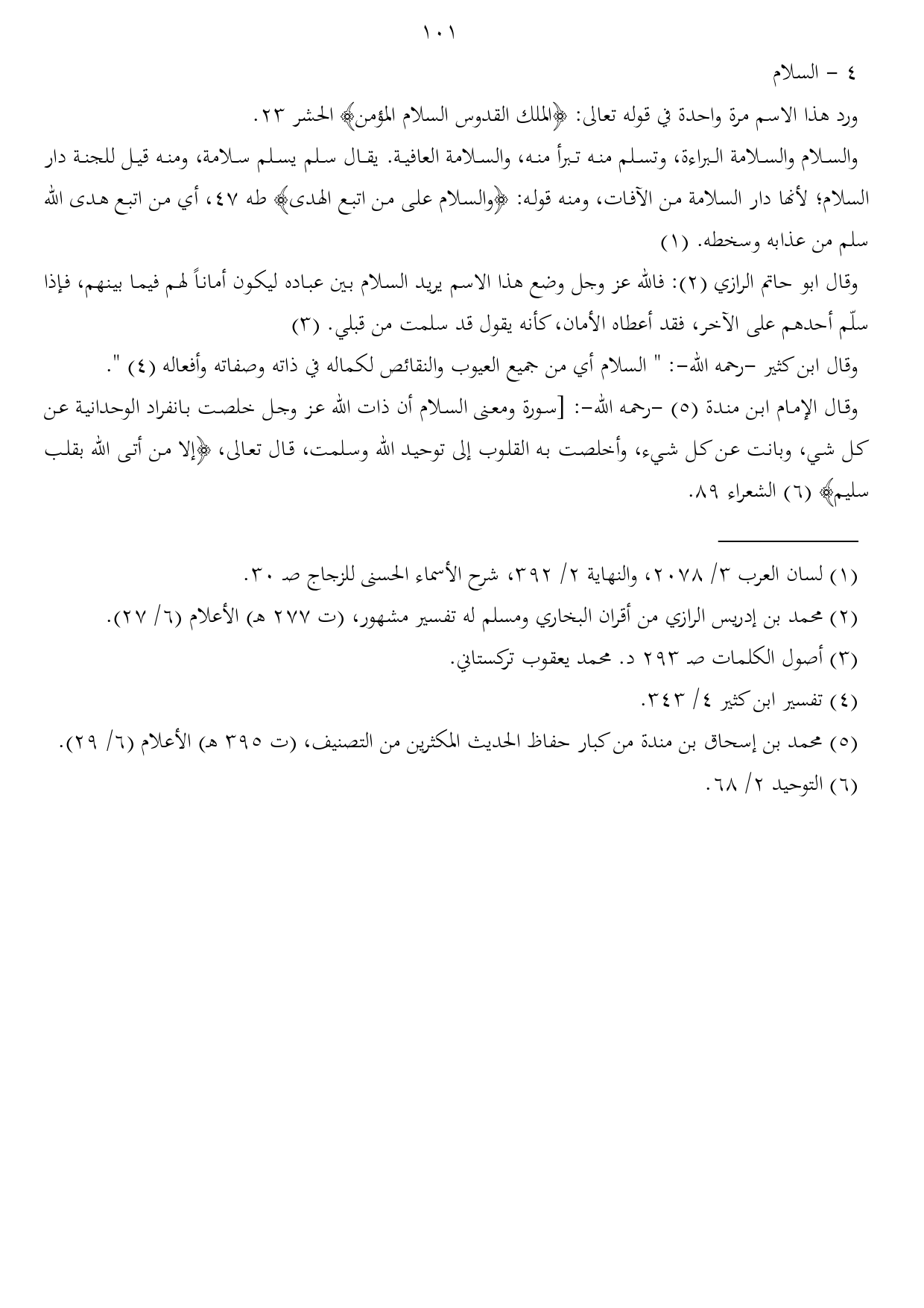 وقال الإمام ابن مندة (¬5) -رحمه الله-: [سورة ومعنى السلام أن ذات الله عز وجل خلصت بانفراد الوحدانية عن كل شي، وبانت عن كل شيء، وأخلصت به القلوب إلى توحيد الله وسلمت، قال تعالى، {إلا من أتى الله بقلب سليم} (¬6) الشعراء 89.