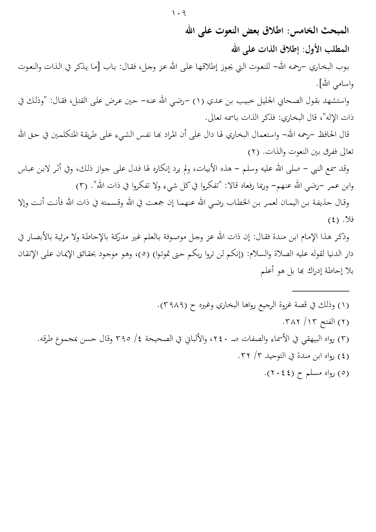 واستشهد بقول الصحابي الجليل خبيب بن عدي (¬1) -رضي الله عنه- حين عرض على القتل، فقال: "وذلك في ذات الإله"، قال البخاري: فذكر الذات باسمه تعالى.