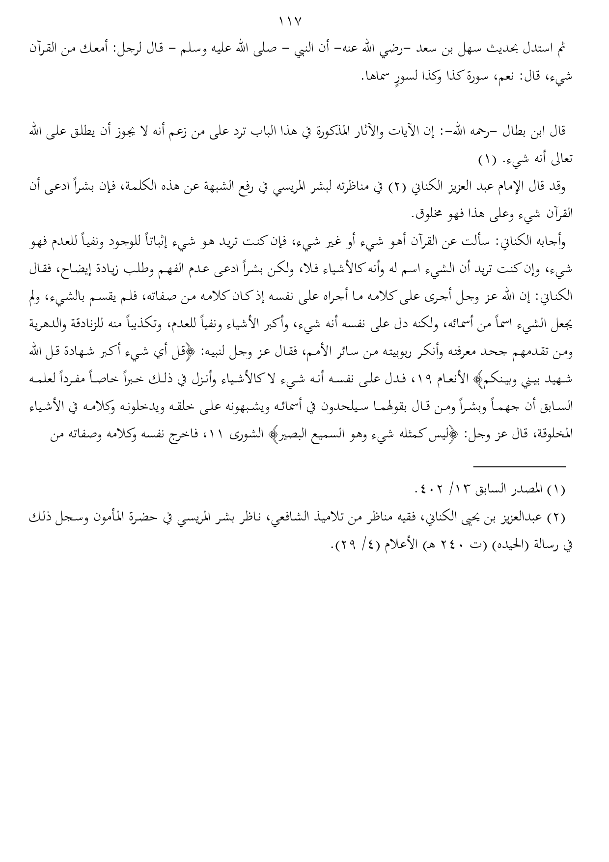 وقد قال الإمام عبد العزيز الكناني (¬2) في مناظرته لبشر المريسي في رفع الشبهة عن هذه الكلمة، فإن بشراً ادعى أن القرآن شيء وعلى هذا فهو مخلوق.