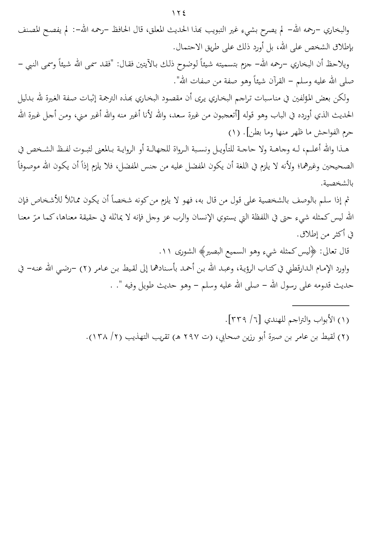 ويلاحظ أن البخاري -رحمه الله- جزم بتسميته شيئاً لوضوح ذلك بالآيتين فقال: "فقد سمى الله شيئاً وسمى النبي - صلى الله عليه وسلم - القرآن شيئاً وهو صفة من صفات الله".