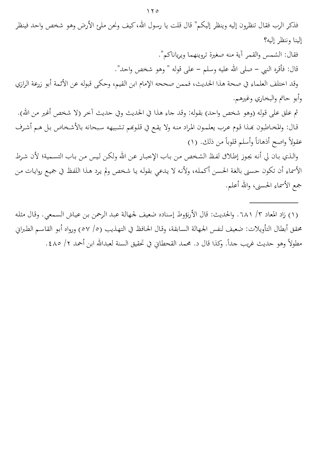 (¬1) زاد المعاد 3/ 681. والحديث: قال الأرنؤوط إسناده ضعيف لجهالة عبد الرحمن بن عياش السمعي. وقال مثله محقق أبطال التأويلات: ضعيف لنفس الجهالة السابقة، وقال الحافظ في التهذيب (5/ 57) ورواه أبو القاسم الطبراني مطولاً وهو حديث غريب جداً. وكذا قال د. محمد القحطاني في تحقيق السنة لعبدالله ابن أحمد 2/ 485.