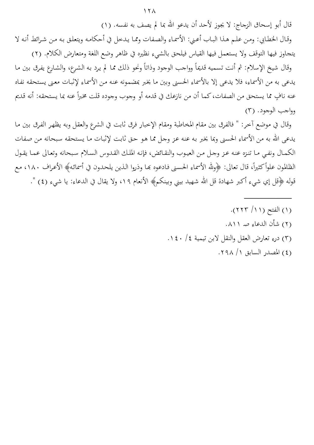وقال في موضع آخر: " فالفرق بين مقام المخاطبة ومقام الإخبار فرق ثابت في الشرع والعقل وبه يظهر الفرق بين ما يدعى الله به من الأسماء الحسنى وبما يخبر به عنه عز وجل مما هو حق ثابت لإثبات ما يستحقه سبحانه من صفات الكمال ونفي ما تنزه عنه عز وجل من العيوب والنقائض، فإنه الملك القدوس السلام سبحانه وتعالى عما يقول الظالمون علواً كثيراً، قال تعالى: {ولله الأسماء الحسنى فادعوه بها وذروا الذين يلحدون في أسمائه} الأعراف 180، مع قوله {قل إي شيء أكبر شهادة قل الله شهيد بيني وبينكم} الأنعام 19، ولا يقال في الدعاء: يا شيء (¬4) ".