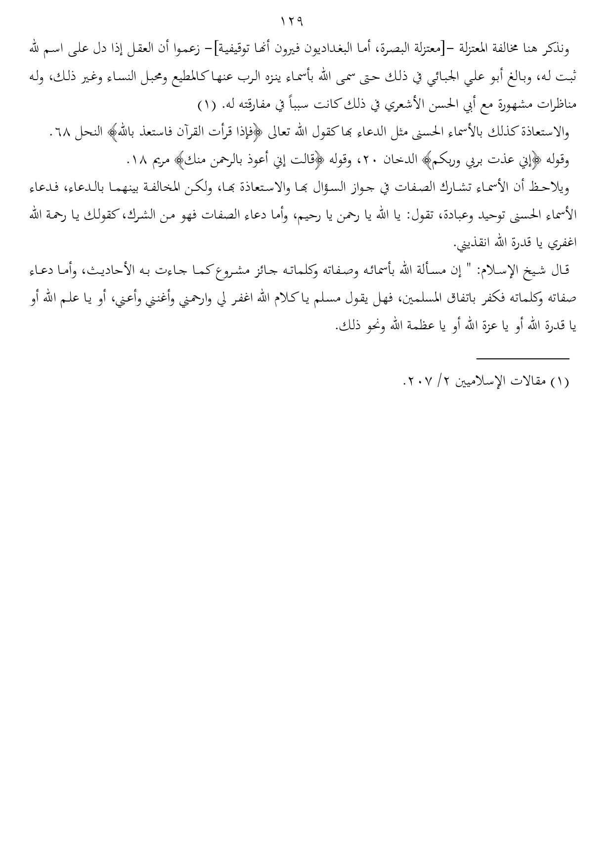 ونذكر هنا مخالفة المعتزلة -[معتزلة البصرة، أما البغداديون فيرون أنها توقيفية]- زعموا أن العقل إذا دل على اسم لله ثبت له، وبالغ أبو علي الجبائي في ذلك حتى سمى الله بأسماء ينزه الرب عنها كالمطيع ومحبل النساء وغير ذلك، وله مناظرات مشهورة مع أبي الحسن الأشعري في ذلك كانت سبباً في مفارقته له. (¬1)