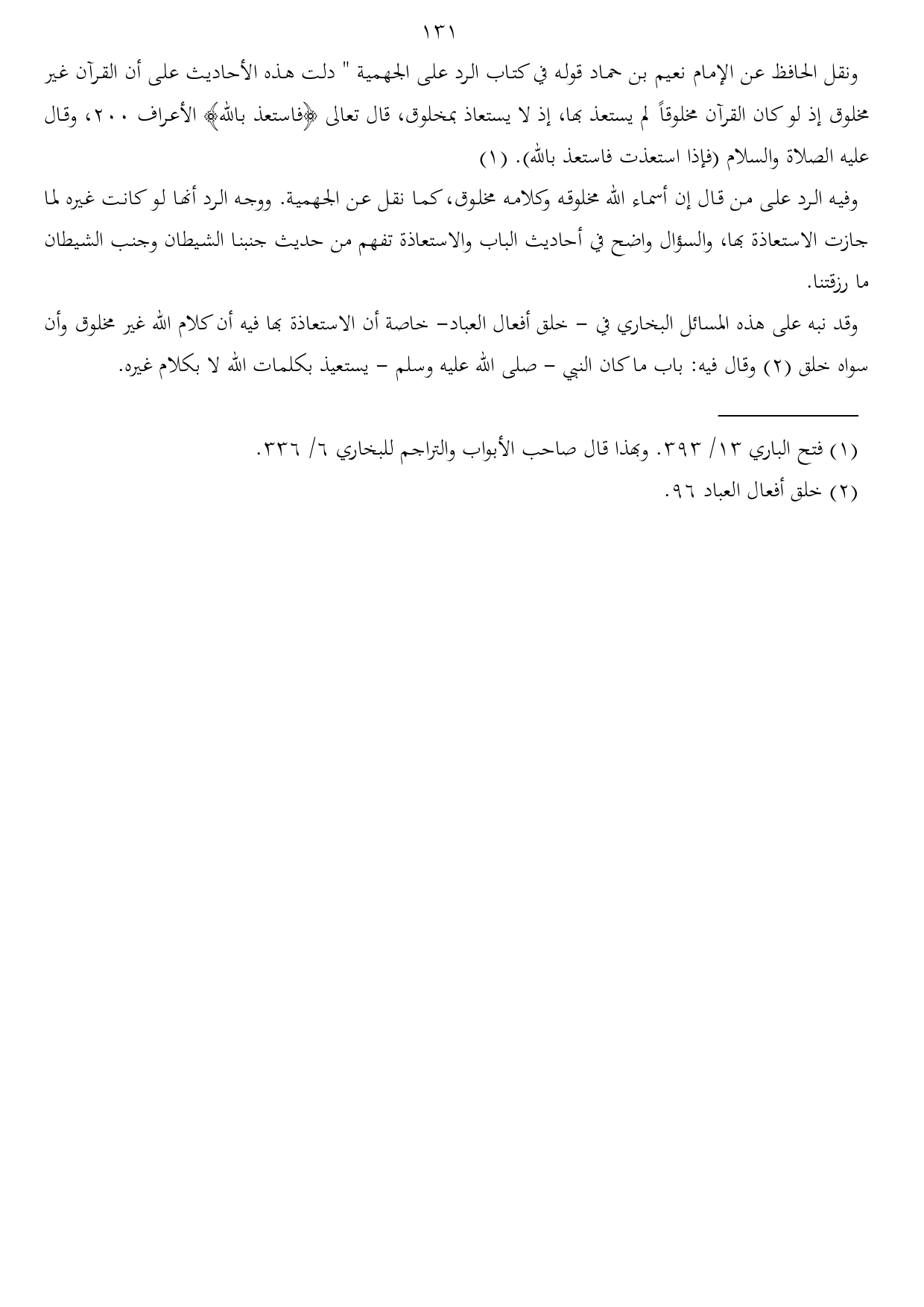 ونقل الحافظ عن الإمام نعيم بن حماد قوله في كتاب الرد على الجهمية " دلت هذه الأحاديث على أن القرآن غير مخلوق إذ لو كان القرآن مخلوقاً لم يستعذ بها، إذ لا يستعاذ بمخلوق، قال تعالى {فاستعذ بالله} الأعراف 200، وقال عليه الصلاة والسلام (فإذا استعذت فاستعذ بالله). (¬1)