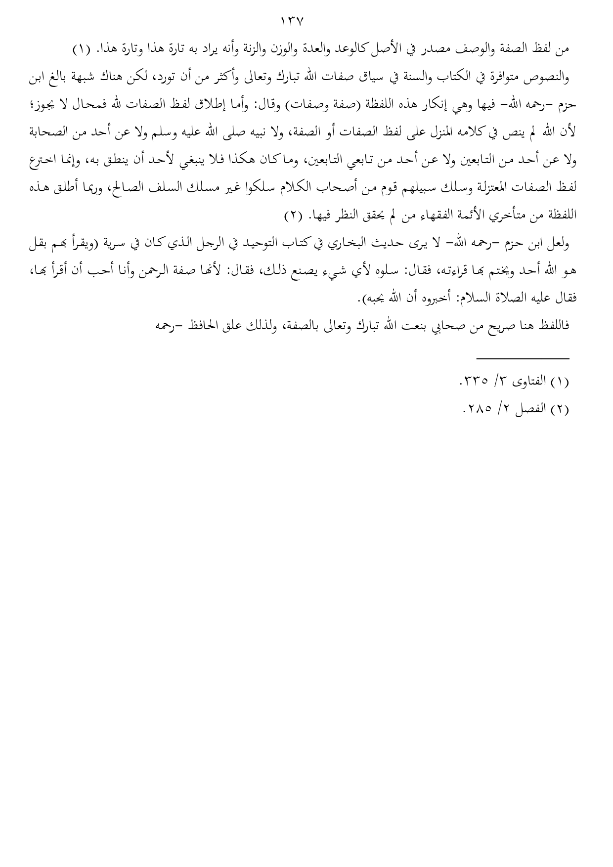 والنصوص متوافرة في الكتاب والسنة في سياق صفات الله تبارك وتعالى وأكثر من أن تورد، لكن هناك شبهة بالغ ابن حزم -رحمه الله- فيها وهي إنكار هذه اللفظة (صفة وصفات) وقال: وأما إطلاق لفظ الصفات لله فمحال لا يجوز؛ لأن الله لم ينص في كلامه المنزل على لفظ الصفات أو الصفة، ولا نبيه صلى الله عليه وسلم ولا عن أحد من الصحابة ولا عن أحد من التابعين ولا عن أحد من تابعي التابعين، وما كان هكذا فلا ينبغي لأحد أن ينطق به، وإنما اخترع لفظ الصفات المعتزلة وسلك سبيلهم قوم من أصحاب الكلام سلكوا غير مسلك السلف الصالح، وربما أطلق هذه اللفظة من متأخري الأئمة الفقهاء من لم يحقق النظر فيها. (¬2)