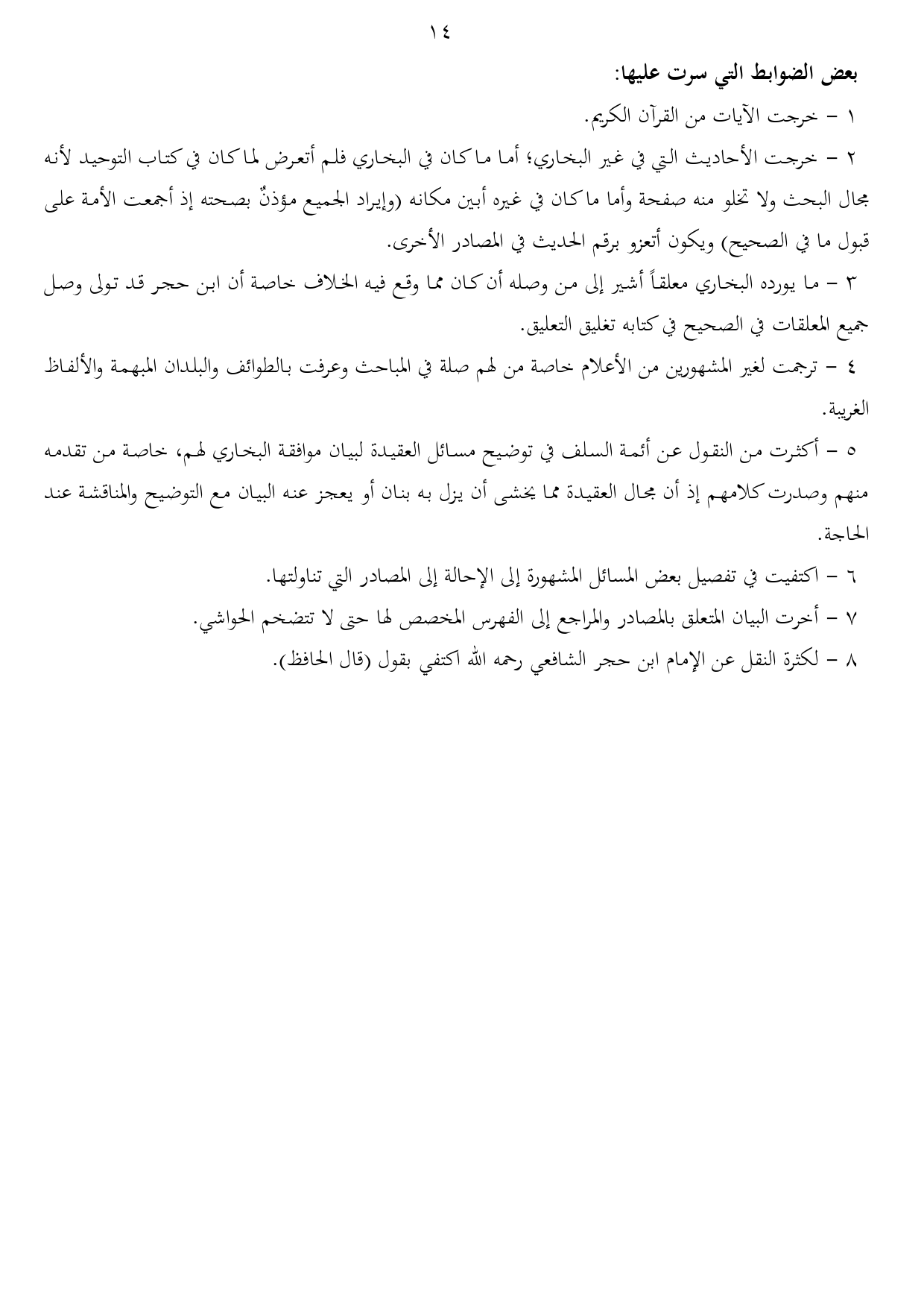 5 - أكثرت من النقول عن أئمة السلف في توضيح مسائل العقيدة لبيان موافقة البخاري لهم، خاصة من تقدمه منهم وصدرت كلامهم إذ أن مجال العقيدة مما يخشى أن يزل به بنان أو يعجز عنه البيان مع التوضيح والمناقشة عند الحاجة.
