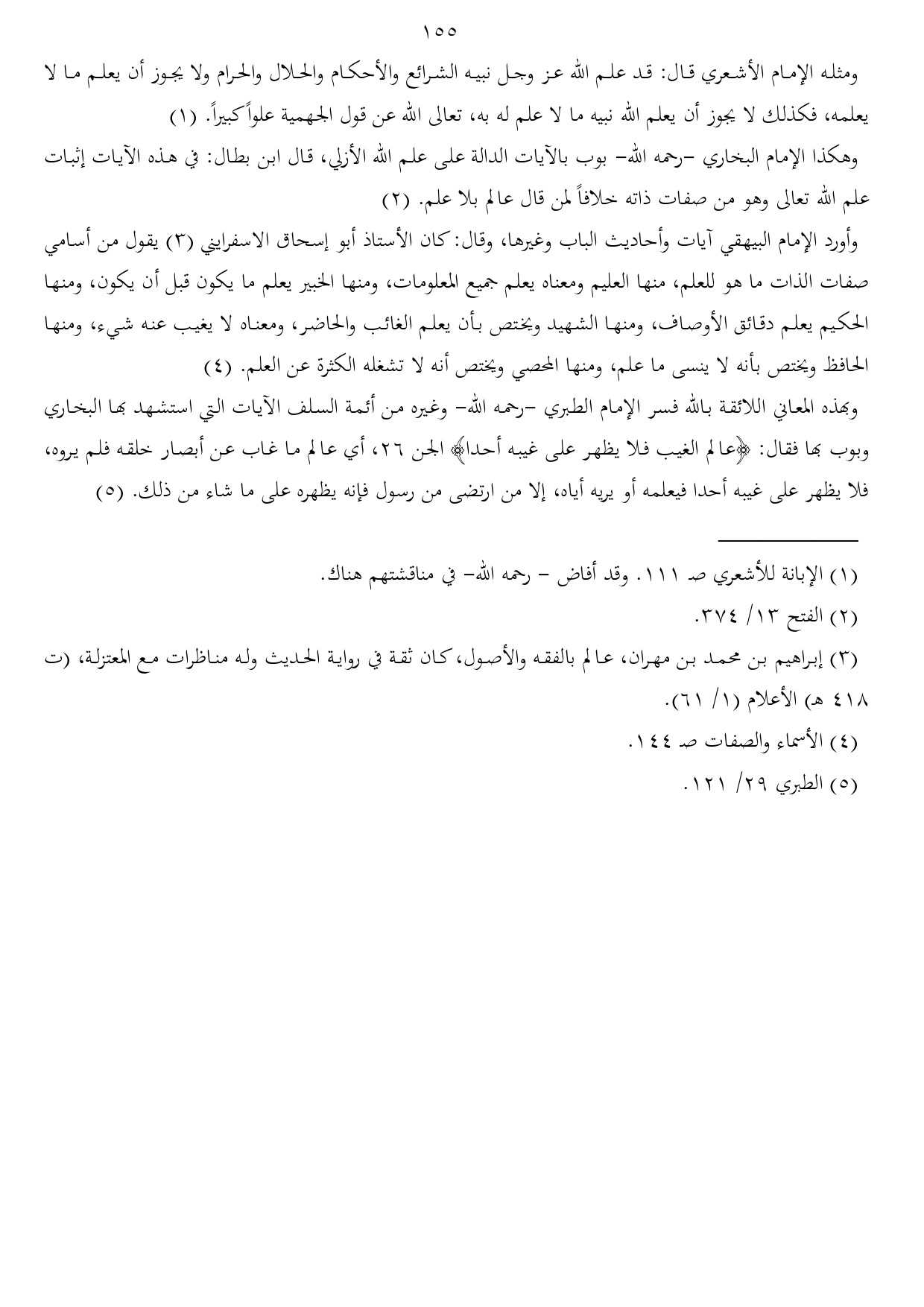 وبهذه المعاني اللائقة بالله فسر الإمام الطبري -رحمه الله- وغيره من أئمة السلف الآيات التي استشهد بها البخاري وبوب بها فقال: {عالم الغيب فلا يظهر على غيبه أحدا} الجن 26، أي عالم ما غاب عن أبصار خلقه فلم يروه، فلا يظهر على غيبه أحدا فيعلمه أو يريه أياه، إلا من ارتضى من رسول فإنه يظهره على ما شاء من ذلك. (¬5)