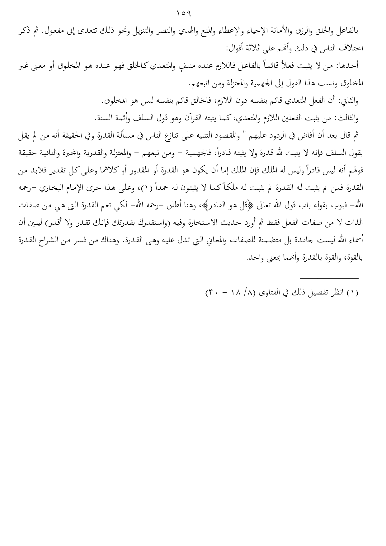 بالفاعل والخلق والرزق والأمانة الإحياء والإعطاء والمنع والهدي والنصر والتنزيل ونحو ذلك تتعدى إلى مفعول. ثم ذكر اختلاف الناس في ذلك وأنهم على ثلاثة أقوال: