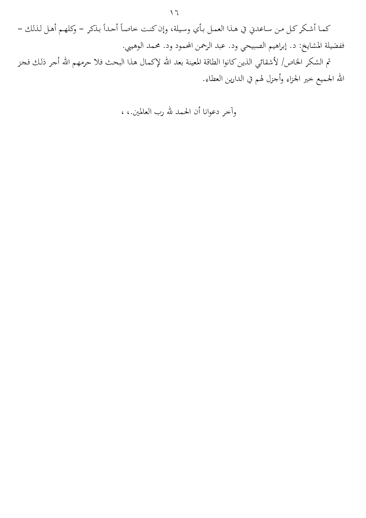كما أشكر كل من ساعدني في هذا العمل بأي وسيلة، وإن كنت خاصاً أحداً بذكر - وكلهم أهل لذلك - ففضيلة المشايخ: د. إبراهيم الصبيحي ود. عبد الرحمن المحمود ود. محمد الوهيبي.