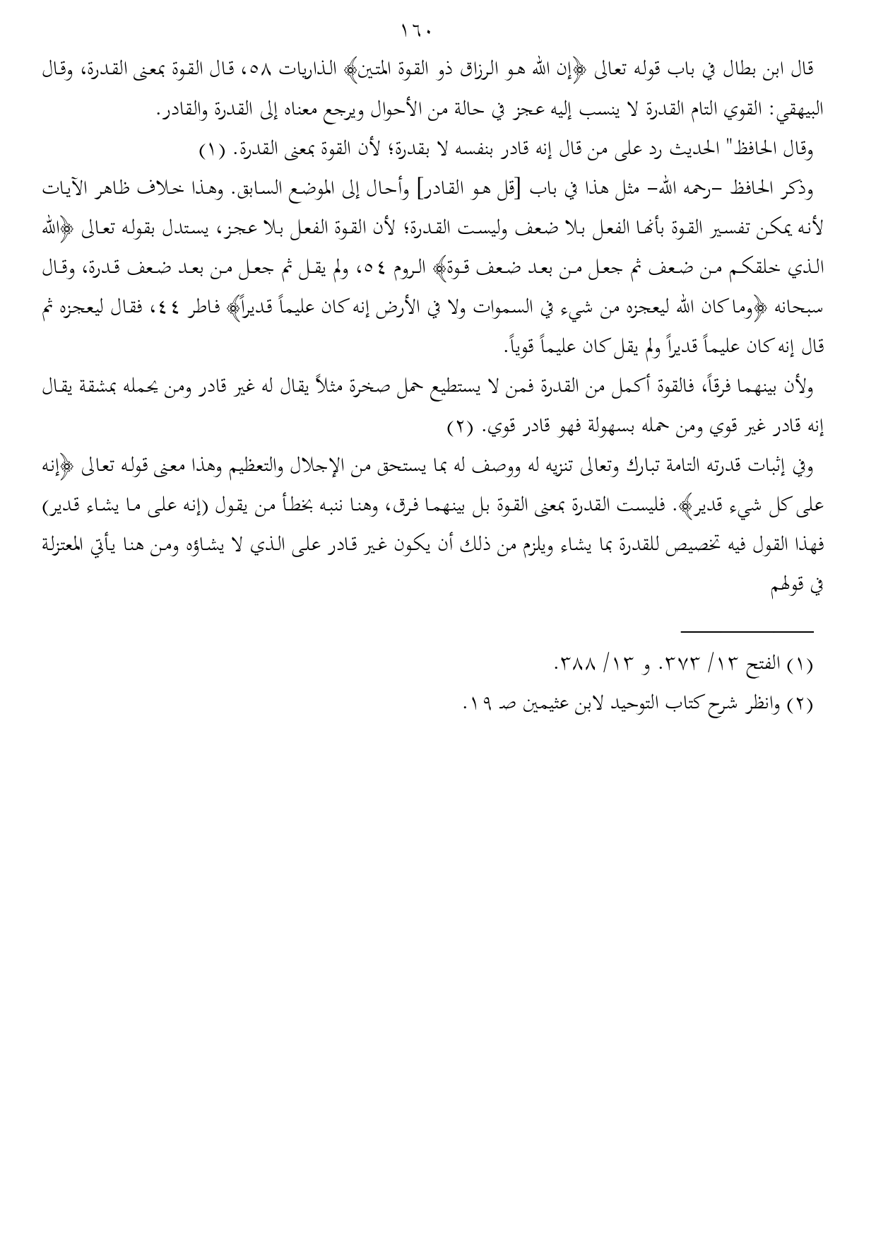 وذكر الحافظ -رحمه الله- مثل هذا في باب [قل هو القادر] وأحال إلى الموضع السابق. وهذا خلاف ظاهر الآيات لأنه يمكن تفسير القوة بأنها الفعل بلا ضعف وليست القدرة؛ لأن القوة الفعل بلا عجز، يستدل بقوله تعالى {الله الذي خلقكم من ضعف ثم جعل من بعد ضعف قوة} الروم 54، ولم يقل ثم جعل من بعد ضعف قدرة، وقال سبحانه {وما كان الله ليعجزه من شيء في السموات ولا في الأرض إنه كان عليماً قديراً} فاطر 44، فقال ليعجزه ثم قال إنه كان عليماً قديراً ولم يقل كان عليماً قوياً.