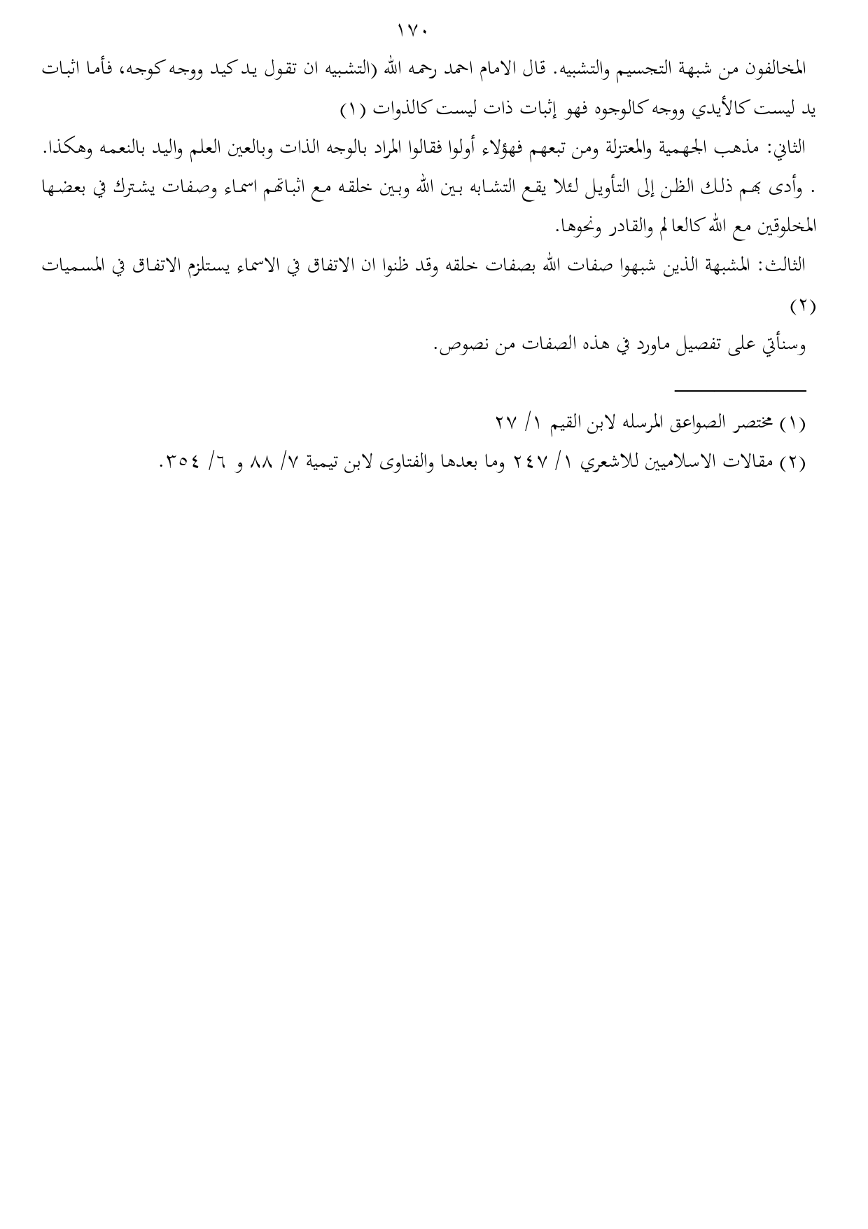 المخالفون من شبهة التجسيم والتشبيه. قال الامام احمد رحمه الله (التشبيه ان تقول يد كيد ووجه كوجه، فأما اثبات يد ليست كالأيدي ووجه كالوجوه فهو إثبات ذات ليست كالذوات (¬1)