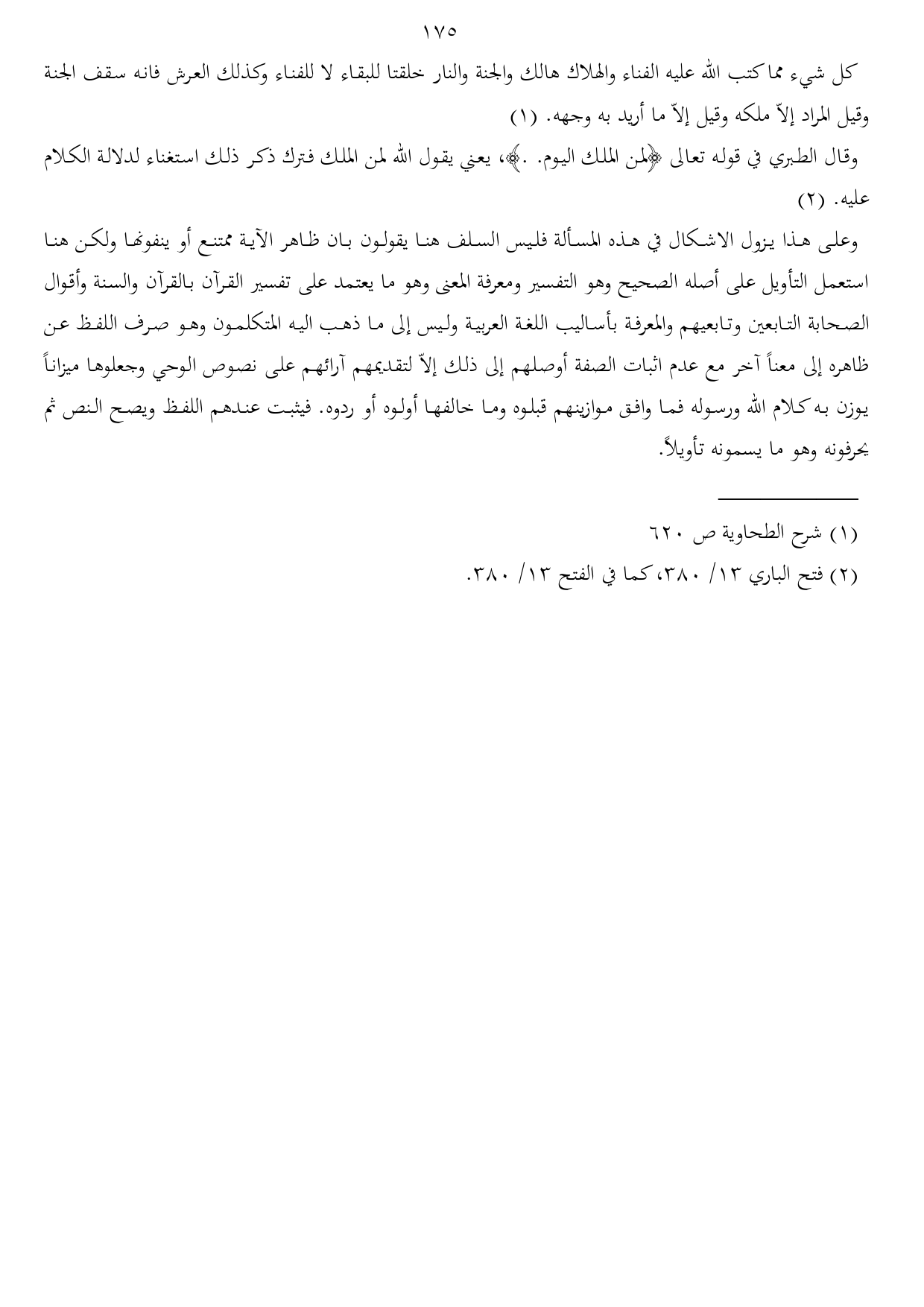 وعلى هذا يزول الاشكال في هذه المسألة فليس السلف هنا يقولون بان ظاهر الآية ممتنع أو ينفونها ولكن هنا استعمل التأويل على أصله الصحيح وهو التفسير ومعرفة المعنى وهو ما يعتمد على تفسير القرآن بالقرآن والسنة وأقوال الصحابة التابعين وتابعيهم والمعرفة بأساليب اللغة العربية وليس إلى ما ذهب اليه المتكلمون وهو صرف اللفظ عن ظاهره إلى معناً آخر مع عدم اثبات الصفة أوصلهم إلى ذلك إلاّ لتقديمهم آرائهم على نصوص الوحي وجعلوها ميزاناً يوزن به كلام الله ورسوله فما وافق موازينهم قبلوه وما خالفها أولوه أو ردوه. فيثبت عندهم اللفظ ويصح النص ثم يحرفونه وهو ما يسمونه تأويلاً.
