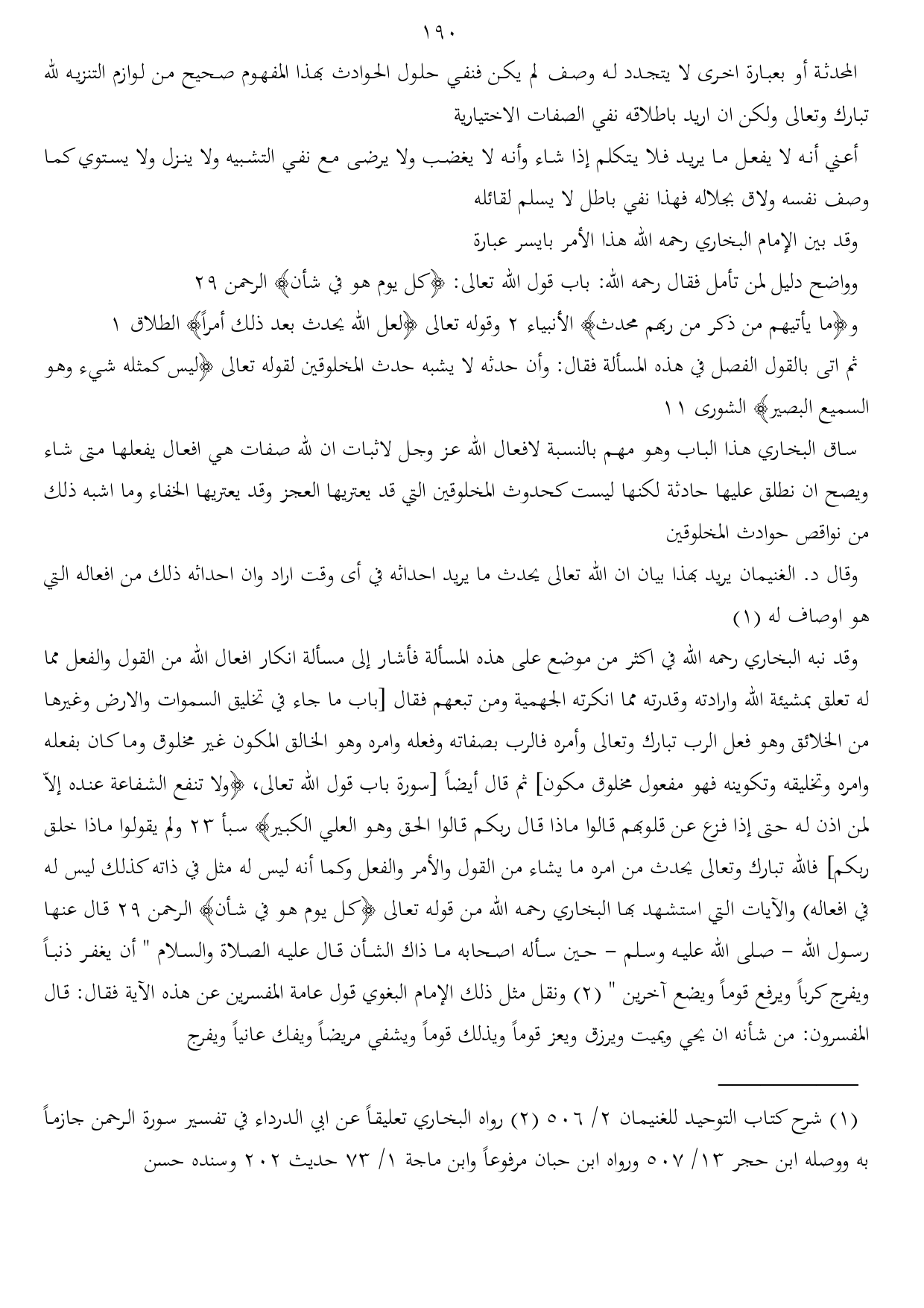 فالله تبارك وتعالى يحدث من امره ما يشاء من القول والأمر والفعل وكما أنه ليس له مثل في ذاته كذلك ليس له في افعاله) والآيات التي استشهد بها البخاري رحمه الله من قوله تعالى {كل يوم هو في شأن} الرحمن 29 قال عنها رسول الله - صلى الله عليه وسلم - حين سأله اصحابه ما ذاك الشأن قال عليه الصلاة والسلام " أن يغفر ذنباً ويفرج كرباً ويرفع قوماً ويضع آخرين " (¬2)