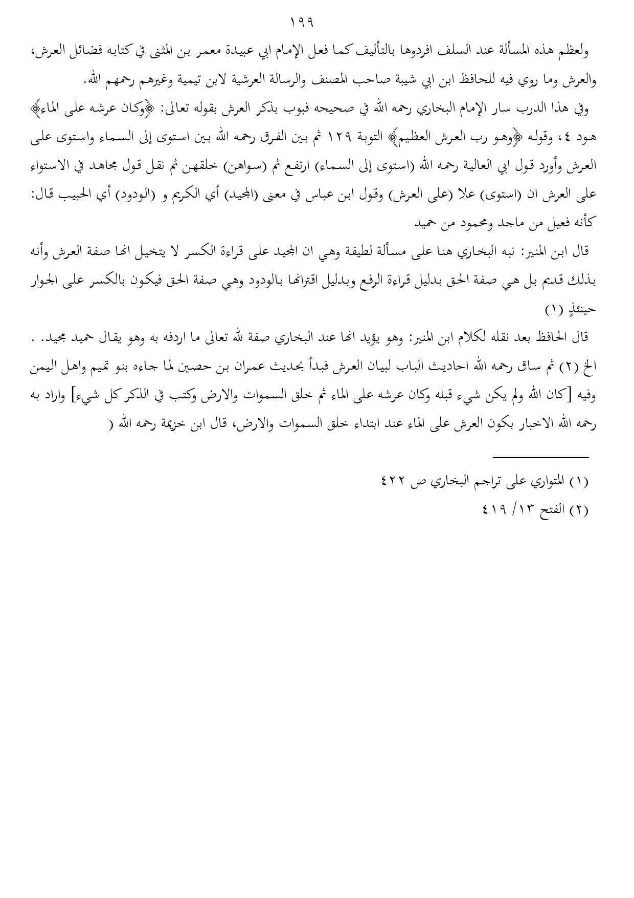 وفي هذا الدرب سار الإمام البخاري رحمه الله في صحيحه فبوب بذكر العرش بقوله تعالى: {وكان عرشه على الماء} هود 4، وقوله {وهو رب العرش العظيم} التوبة 129 ثم بين الفرق رحمه الله بين استوى إلى السماء واستوى على العرش وأورد قول ابي العالية رحمه الله (استوى إلى السماء) ارتفع ثم (سواهن) خلقهن ثم نقل قول مجاهد في الاستواء على العرش ان (استوى) علا (على العرش) وقول ابن عباس في معنى (المجيد) أي الكريم و (الودود) أي الحبيب قال: كأنه فعيل من ماجد ومحمود من حميد