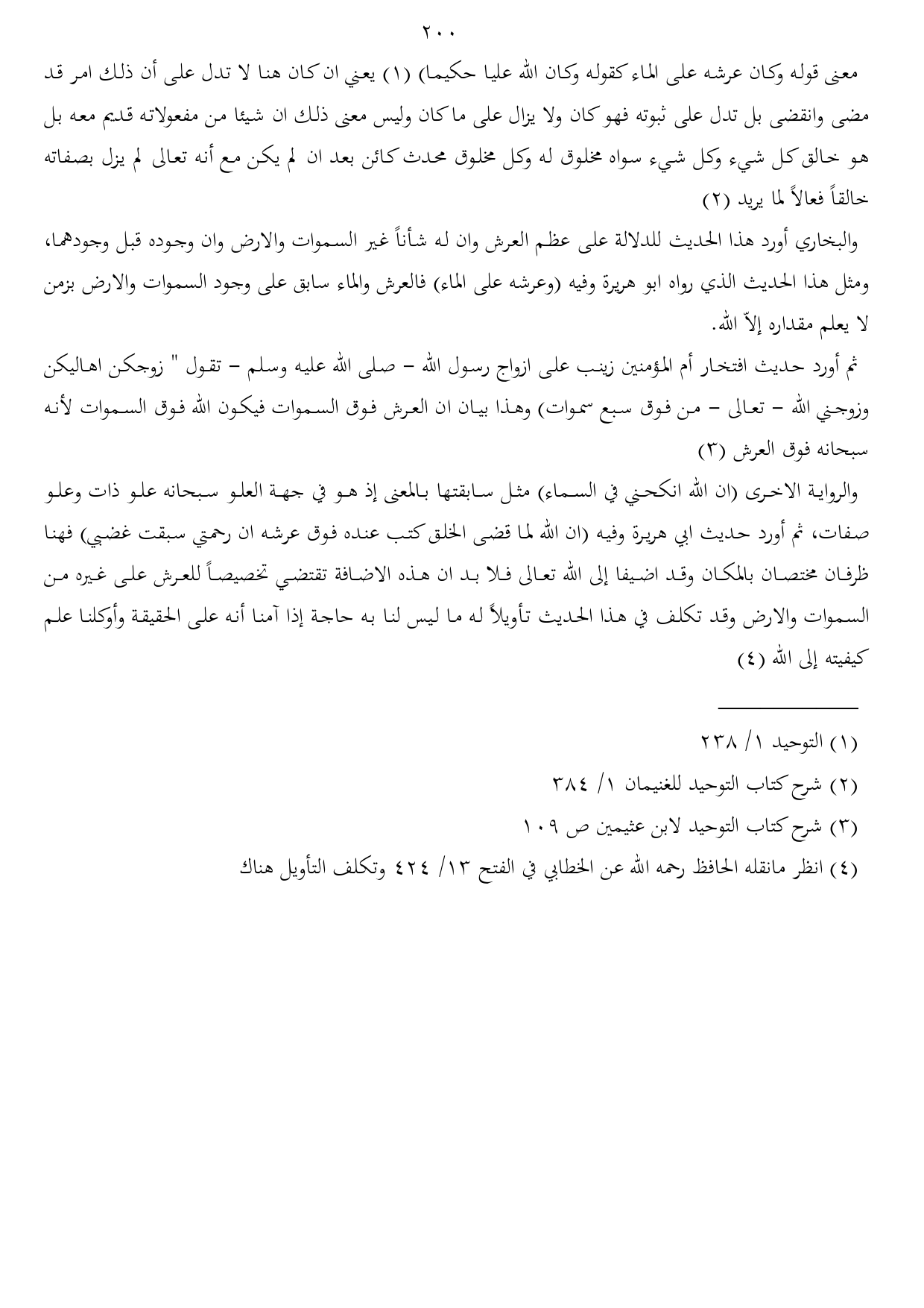 والرواية الاخرى (ان الله انكحني في السماء) مثل سابقتها بالمعنى إذ هو في جهة العلو سبحانه علو ذات وعلو صفات، ثم أورد حديث ابي هريرة وفيه (ان الله لما قضى الخلق كتب عنده فوق عرشه ان رحمتي سبقت غضبي) فهنا ظرفان مختصان بالمكان وقد اضيفا إلى الله تعالى فلا بد ان هذه الاضافة تقتضي تخصيصاً للعرش على غيره من السموات والارض وقد تكلف في هذا الحديث تأويلاً له ما ليس لنا به حاجة إذا آمنا أنه على الحقيقة وأوكلنا علم كيفيته إلى الله (¬4)