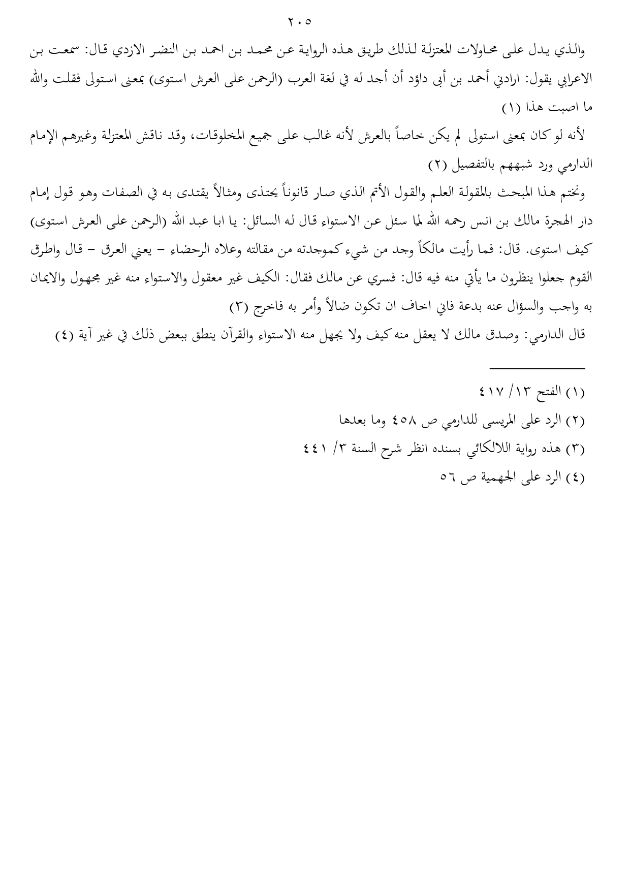والذي يدل على محاولات المعتزلة لذلك طريق هذه الرواية عن محمد بن احمد بن النضر الازدي قال: سمعت بن الاعرابي يقول: ارادني أحمد بن أبى داؤد أن أجد له في لغة العرب (الرحمن على العرش استوى) بمعنى استولى فقلت والله ما اصبت هذا (¬1)