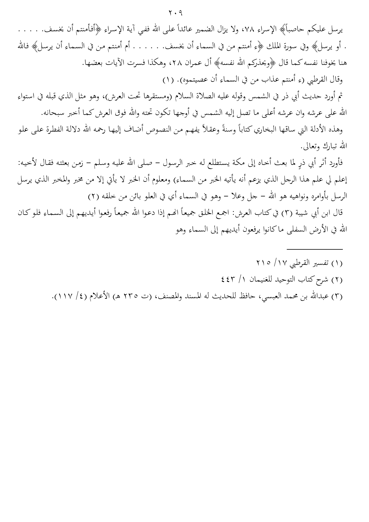 فأورد أثر أبي ذرٍ لما بعث أخاه إلى مكة يستطلع له خبر الرسول - صلى الله عليه وسلم - زمن بعثته فقال لأخيه: إعلم لي علم هذا الرجل الذي يزعم أنه يأتيه الخبر من السماء) ومعلوم أن الخبر لا يأتي إلا من مخبر والمخبر الذي يرسل الرسل بأوامره ونواهيه هو الله - جل وعلا - وهو في السماء أي في العلو بائن من خلقه (¬2)