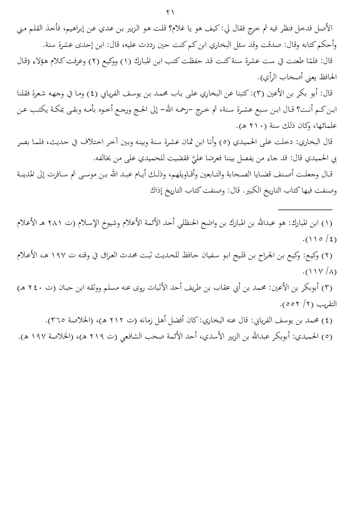 الأصل فدخل فنظر فيه ثم خرج فقال لي: كيف هو يا غلام؟ قلت هو الزبير بن عدي عن إبراهيم، فأخذ القلم مني وأحكم كتابه وقال: صدقت وقد سئل البخاري ابن كم كنت حين رددت عليه، قال: ابن إحدى عشرة سنة.