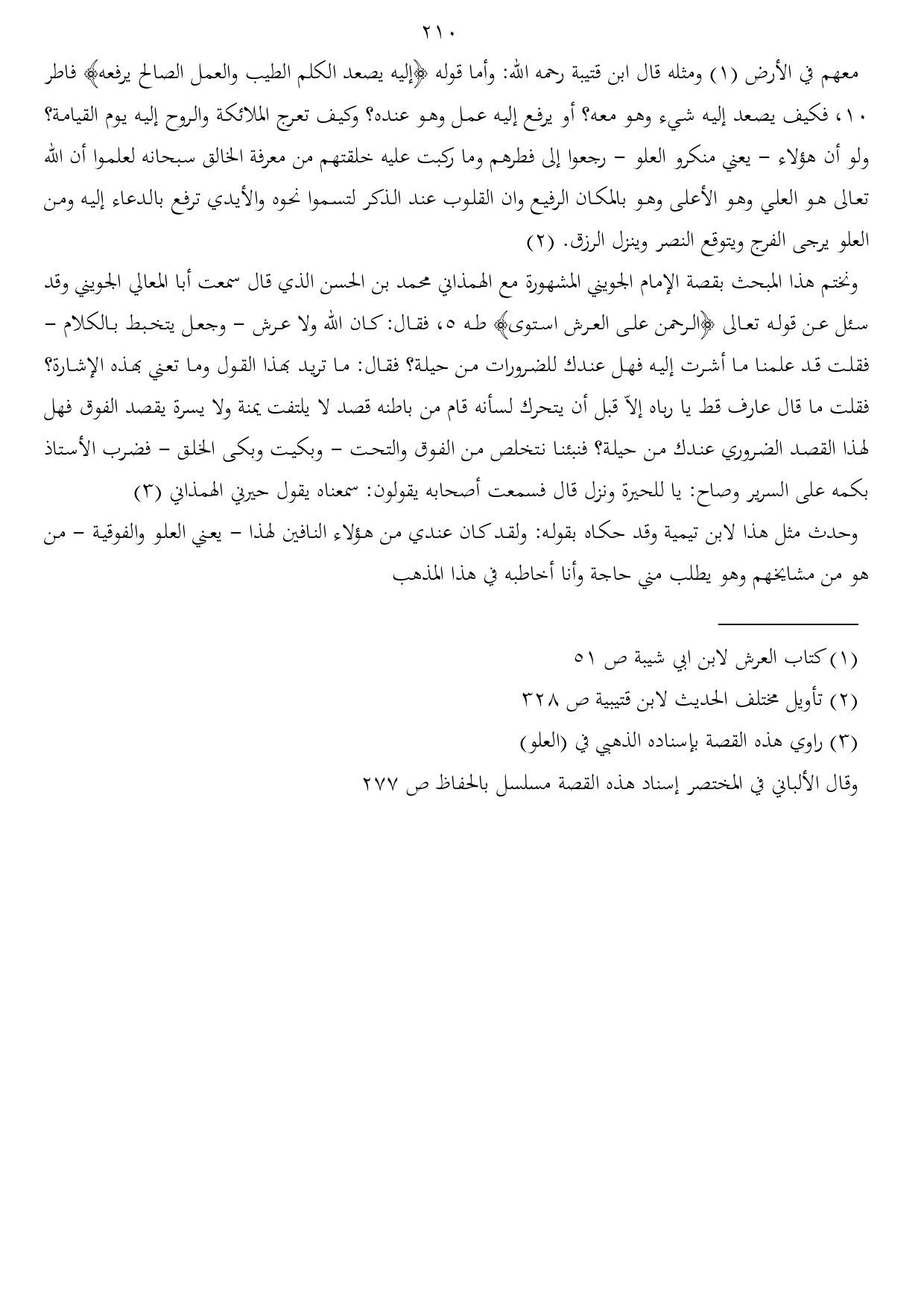 معهم في الأرض (¬1) ومثله قال ابن قتيبة رحمه الله: وأما قوله {إليه يصعد الكلم الطيب والعمل الصالح يرفعه} فاطر 10، فكيف يصعد إليه شيء وهو معه؟ أو يرفع إليه عمل وهو عنده؟ وكيف تعرج الملائكة والروح إليه يوم القيامة؟ ولو أن هؤلاء - يعني منكرو العلو - رجعوا إلى فطرهم وما ركبت عليه خلقتهم من معرفة الخالق سبحانه لعلموا أن الله تعالى هو العلي وهو الأعلى وهو بالمكان الرفيع وان القلوب عند الذكر لتسموا نحوه والأيدي ترفع بالدعاء إليه ومن العلو يرجى الفرج ويتوقع النصر وينزل الرزق. (¬2)