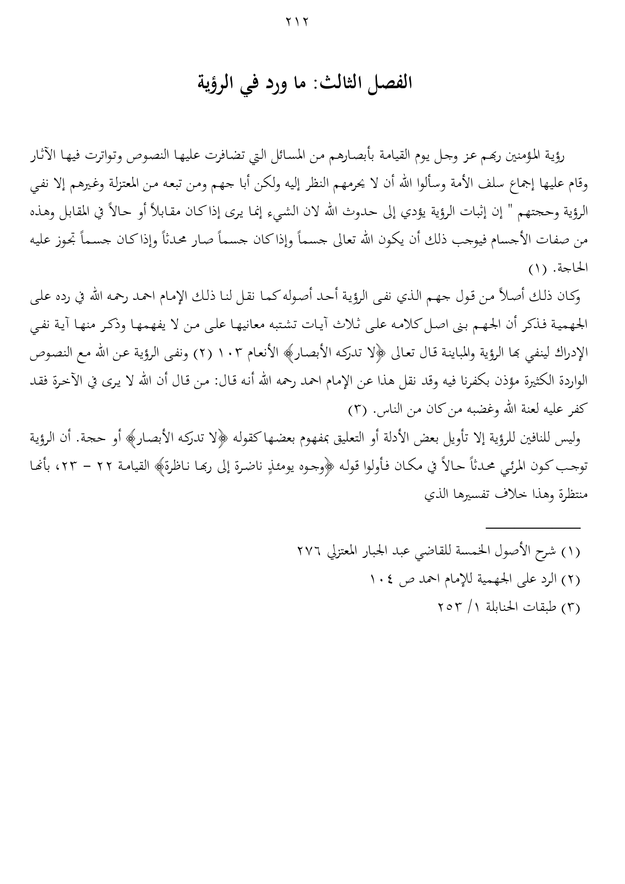 وكان ذلك أصلاً من قول جهم الذي نفى الرؤية أحد أصوله كما نقل لنا ذلك الإمام احمد رحمه الله في رده على الجهمية فذكر أن الجهم بنى اصل كلامه على ثلاث آيات تشتبه معانيها على من لا يفهمها وذكر منها آية نفي الإدراك لينفي بها الرؤية والمباينة قال تعالى {لا تدركه الأبصار} الأنعام 103 (¬2) ونفى الرؤية عن الله مع النصوص الواردة الكثيرة مؤذن بكفرنا فيه وقد نقل هذا عن الإمام احمد رحمه الله أنه قال: من قال أن الله لا يرى في الآخرة فقد كفر عليه لعنة الله وغضبه من كان من الناس. (¬3)