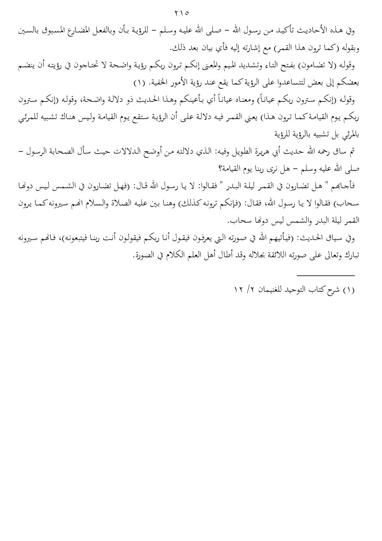 وقوله (إنكم سترون ربكم عياناً) ومعناه عياناً أي بأعينكم وهذا الحديث ذو دلالة واضحة، وقوله (إنكم سترون ربكم يوم القيامة كما ترون هذا) يعني القمر فيه دلالة على أن الرؤية ستقع يوم القيامة وليس هناك تشبيه للمرئي بالمرئي بل تشبيه بالرؤية للرؤية