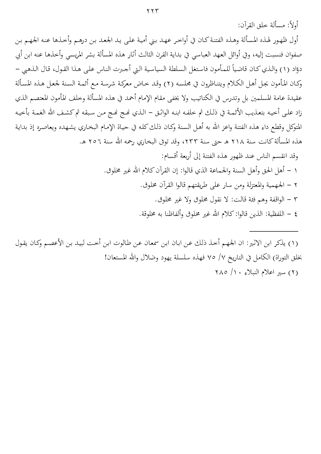 أول ظهور لهذه المسألة وهذه الفتنة كان في أواخر عهد بني أمية على يد الجعد بن درهم وأخذها عنه الجهم بن صفوان فنسبت إليه، وفي أوائل العهد العباسي في بداية القرن الثالث أثار هذه المسألة بشر المريسي وأخذها عنه ابن أبي دؤاد (¬1) والذي كان قاضياً للمأمون فاستغل السلطة السياسية التي أجبرت الناس على هذا القول، قال الذهبي - وكان المأمون يجل أهل الكلام ويتناظرون في مجلسه (¬2) وقد خاض معركة شرسة مع أئمة السنة لجعل هذه المسألة عقيدة عامة المسلمين بل وتدرس في الكتاتيب ولا يخفى مقام الإمام أحمد في هذه المسألة وخلف المأمون المعتصم الذي زاد على أخيه بتعذيب الأئمة في ذلك ثم خلفه ابنه الواثق - الذي نهج نهج من سبقه ثم كشف الله الغمة بأخيه المتوكل وقطع داء هذه الفتنة واعز الله به أهل السنة وكان ذلك كله في حياة الإمام البخاري يشهده ويعاصره إذ بداية هذه المسألة كانت سنة 218 هـ حتى سنة 233، وقد توفى البخاري رحمه الله سنة 256 هـ.