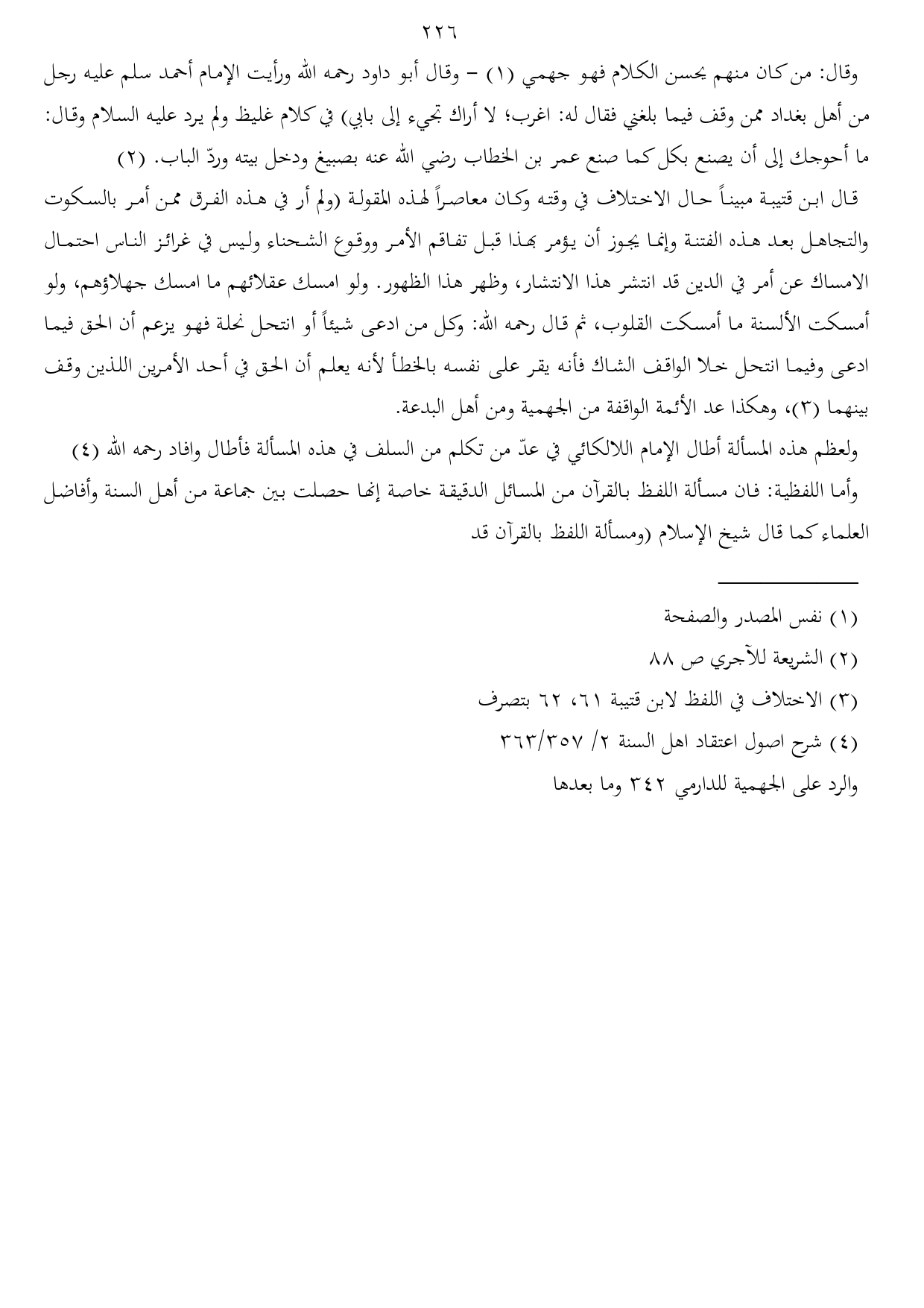 ولعظم هذه المسألة أطال الإمام اللالكائي في عدّ من تكلم من السلف في هذه المسألة فأطال وافاد رحمه الله (¬4)