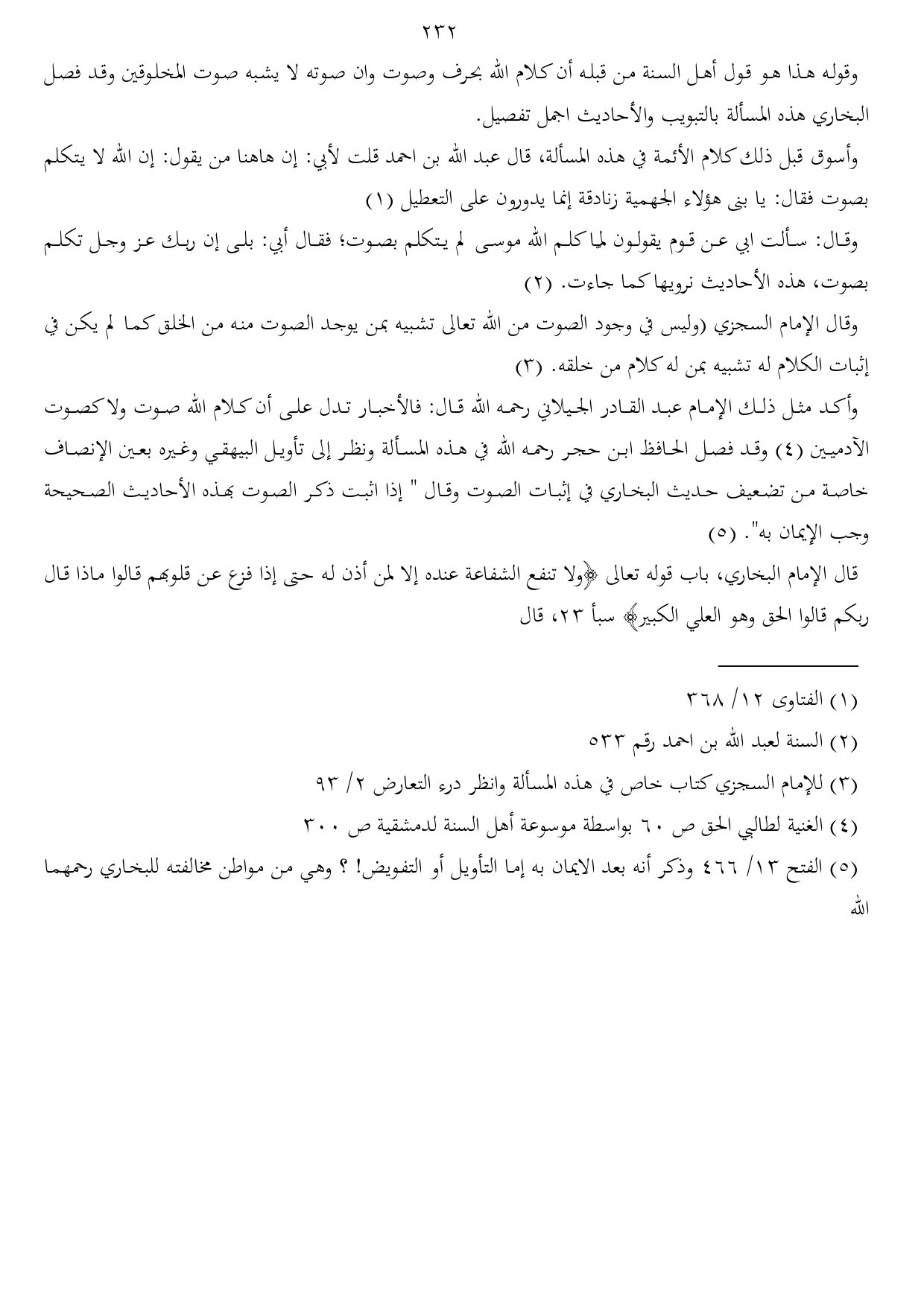 وقال الإمام السجزي (وليس في وجود الصوت من الله تعالى تشبيه بمن يوجد الصوت منه من الخلق كما لم يكن في إثبات الكلام له تشبيه بمن له كلام من خلقه. (¬3)