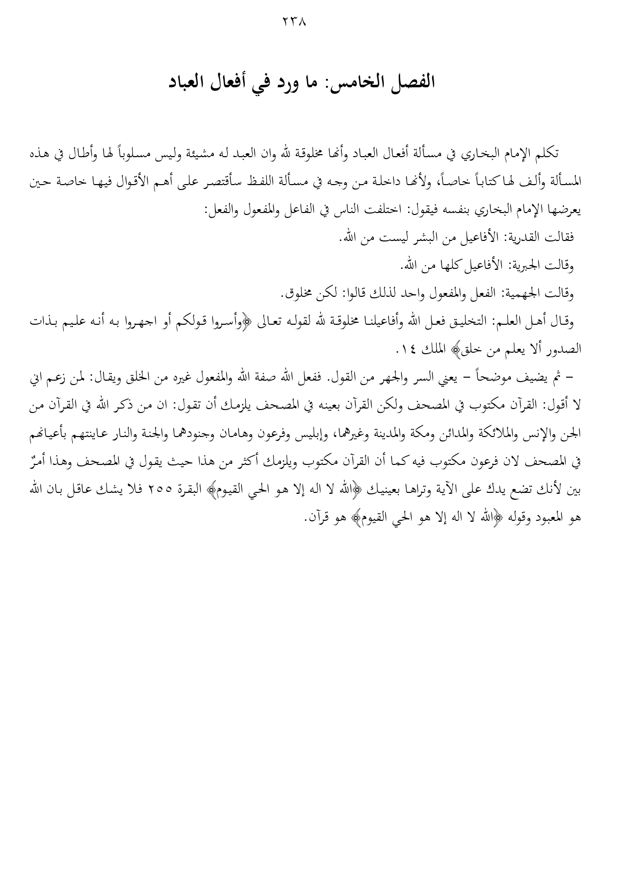 - ثم يضيف موضحاً - يعني السر والجهر من القول. ففعل الله صفة الله والمفعول غيره من الخلق ويقال: لمن زعم اني لا أقول: القرآن مكتوب في المصحف ولكن القرآن بعينه في المصحف يلزمك أن تقول: ان من ذكر الله في القرآن من الجن والإنس والملائكة والمدائن ومكة والمدينة وغيرهما، وإبليس وفرعون وهامان وجنودهما والجنة والنار عاينتهم بأعيانهم في المصحف لان فرعون مكتوب فيه كما أن القرآن مكتوب ويلزمك أكثر من هذا حيث يقول في المصحف وهذا أمرٌ بين لأنك تضع يدك على الآية وتراها بعينيك {الله لا اله إلا هو الحي القيوم} البقرة 255 فلا يشك عاقل بان الله هو المعبود وقوله {الله لا اله إلا هو الحي القيوم} هو قرآن.