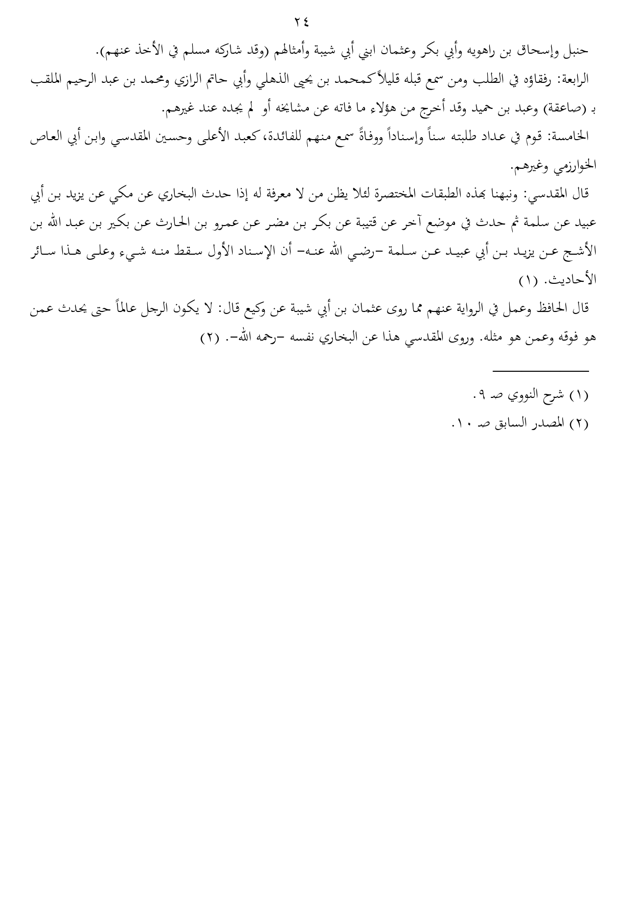 قال المقدسي: ونبهنا بهذه الطبقات المختصرة لئلا يظن من لا معرفة له إذا حدث البخاري عن مكي عن يزيد بن أبي عبيد عن سلمة ثم حدث في موضع آخر عن قتيبة عن بكر بن مضر عن عمرو بن الحارث عن بكير بن عبد الله بن الأشج عن يزيد بن أبي عبيد عن سلمة -رضي الله عنه- أن الإسناد الأول سقط منه شيء وعلى هذا سائر الأحاديث. (¬1)
