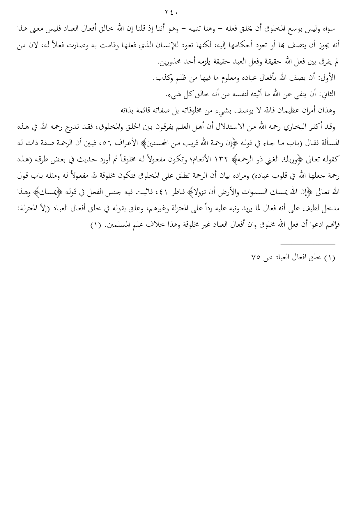 وقد أكثر البخاري رحمه الله من الاستدلال أن أهل العلم يفرقون بين الخلق والمخلوق، فقد تدرج رحمه الله في هذه المسألة فقال (باب ما جاء في قوله {إن رحمة الله قريب من المحسنين} الأعراف 56، فبين أن الرحمة صفة ذات له كقوله تعالى {وربك الغني ذو الرحمة} 132 الأنعام؛ وتكون مفعولاً له مخلوقاً ثم أورد حديث في بعض طرقه (هذه رحمة جعلها الله في قلوب عباده) ومراده بيان أن الرحمة تطلق على المخلوق فتكون مخلوقة لله مفعولاُ له ومثله باب قول الله تعالى {إن الله يمسك السموات والأرض أن تزولا} فاطر 41، فاثبت فيه جنس الفعل في قوله {يمسك} وهذا مدخل لطيف على أنه فعال لما يريد ونبه عليه رداً على المعتزلة وغيرهم، وعلق بقوله في خلق أفعال العباد (إلاّ المعتزلة: فإنهم ادعوا أن فعل الله مخلوق وان أفعال العباد غير مخلوقة وهذا خلاف علم المسلمين. (¬1)